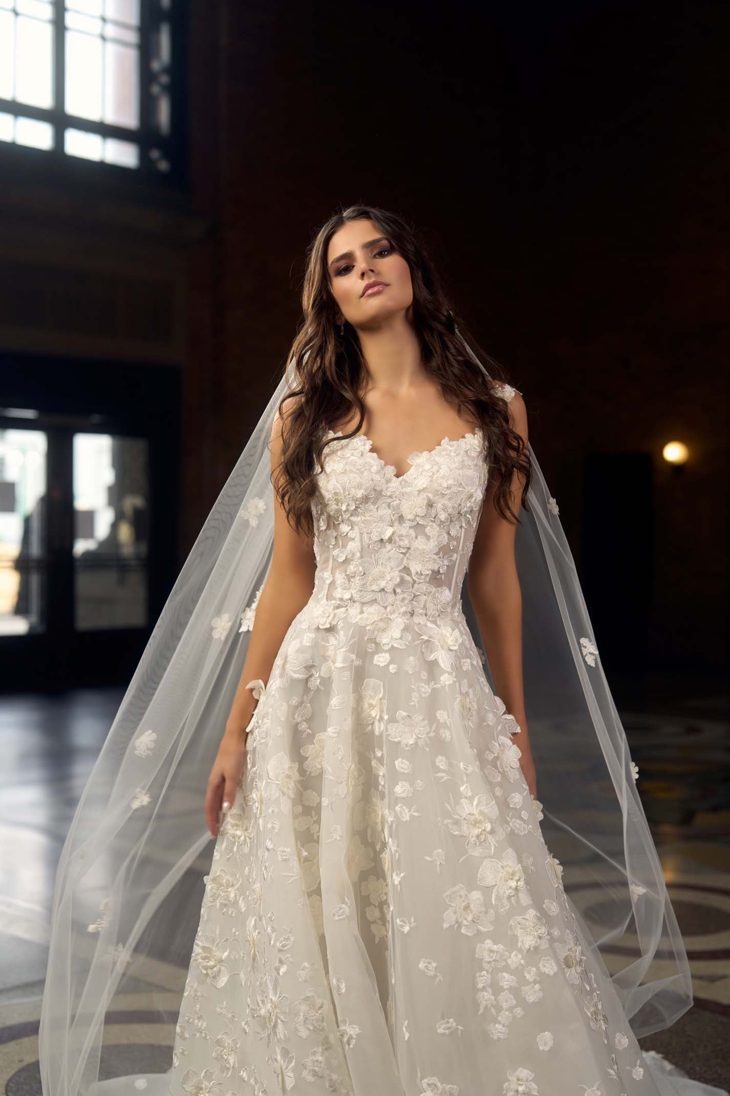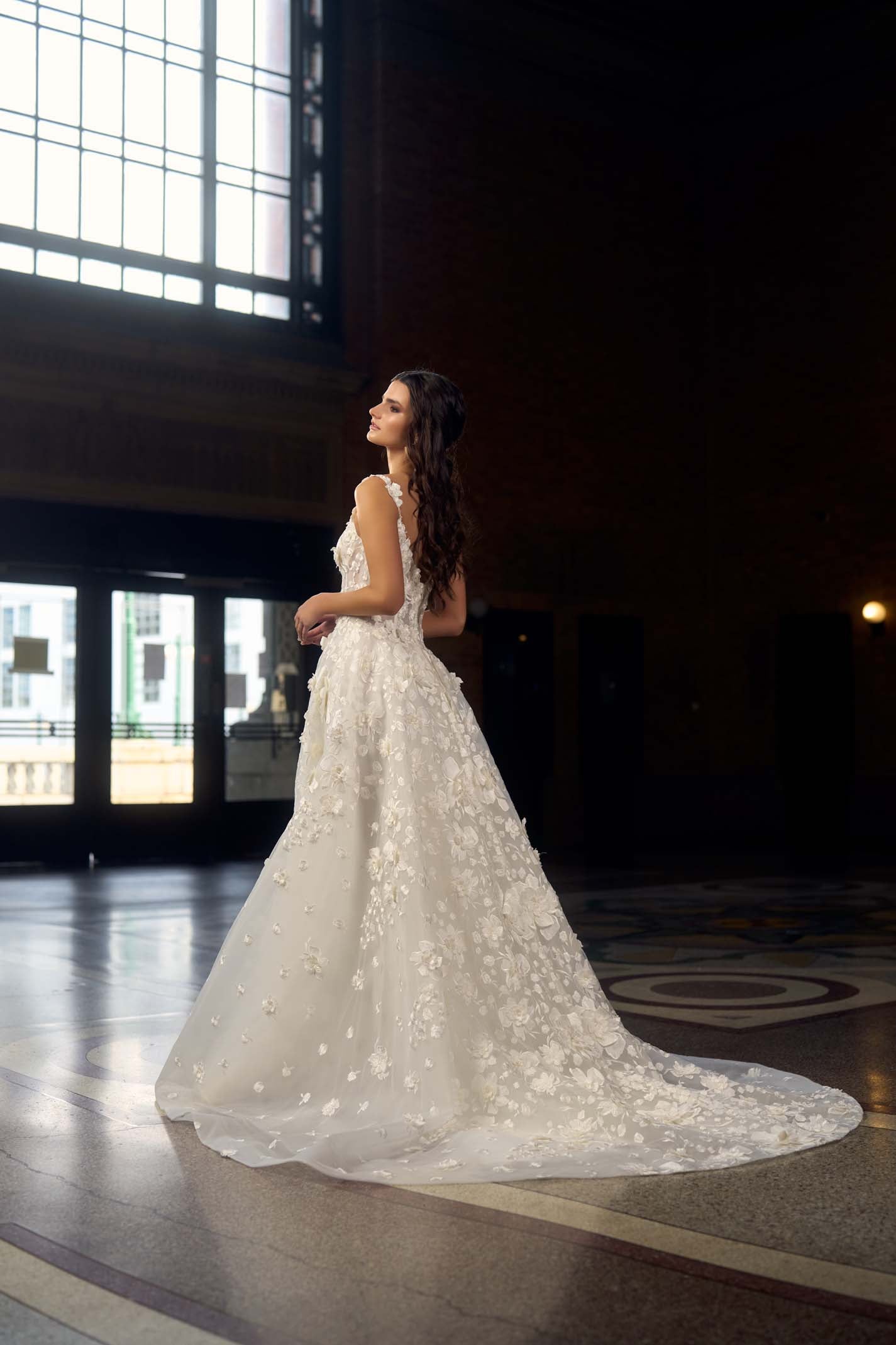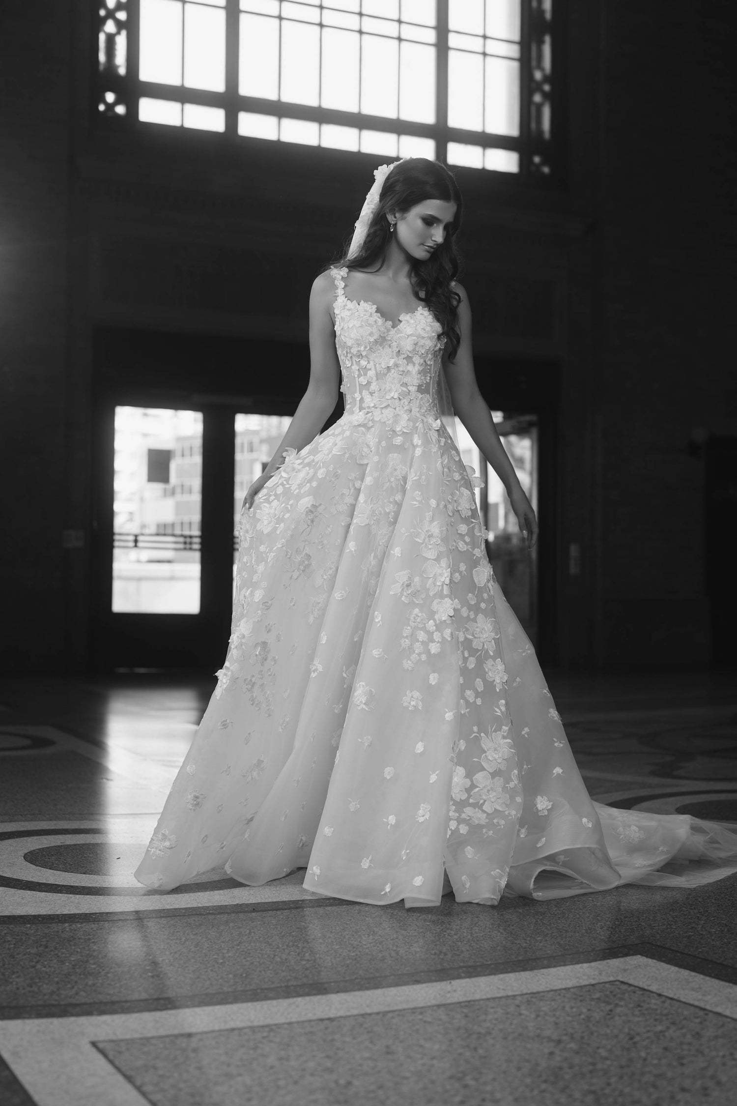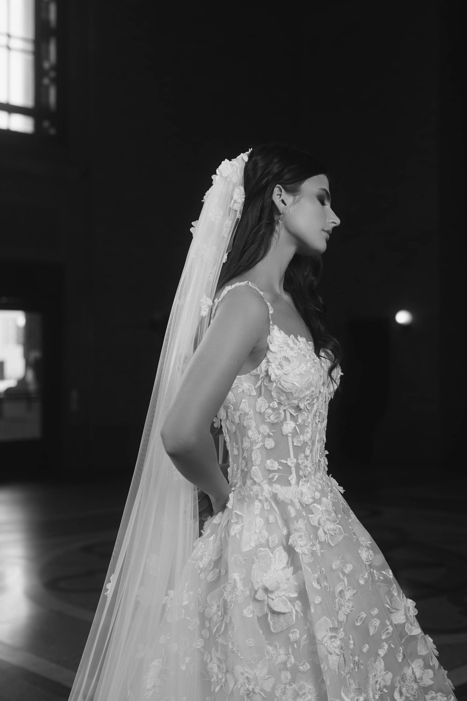 Look no further than our Abi gown if you're seeking a whimsical and captivating dress for your momentous day. Embellished with an intricate floral bodice that presents a sweetheart neckline, complemented by a feather-light A-line tulle skirt. Abi also unveils a train adorned with three-dimensional lace flowers, adding an extra touch of romanticism and beauty.