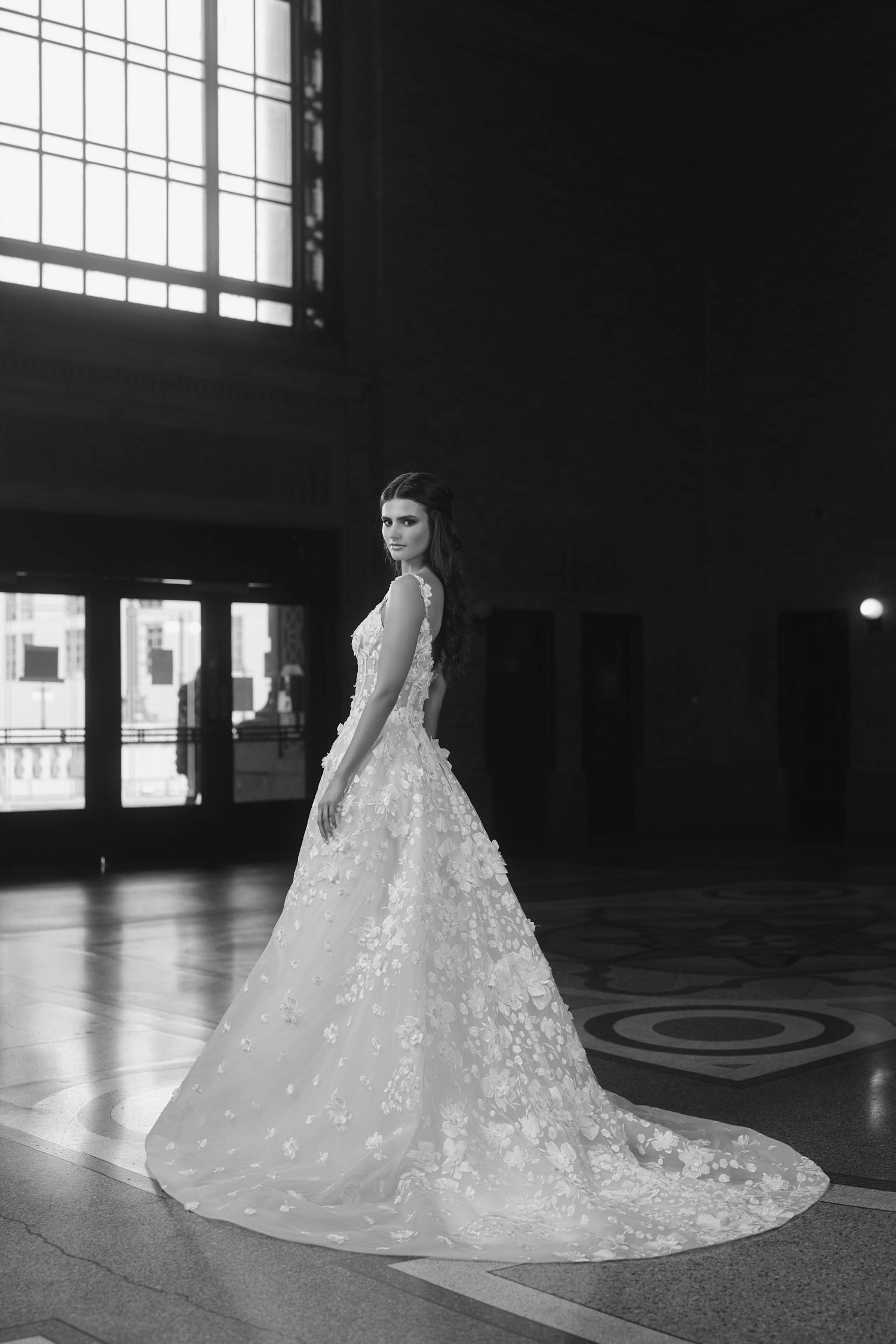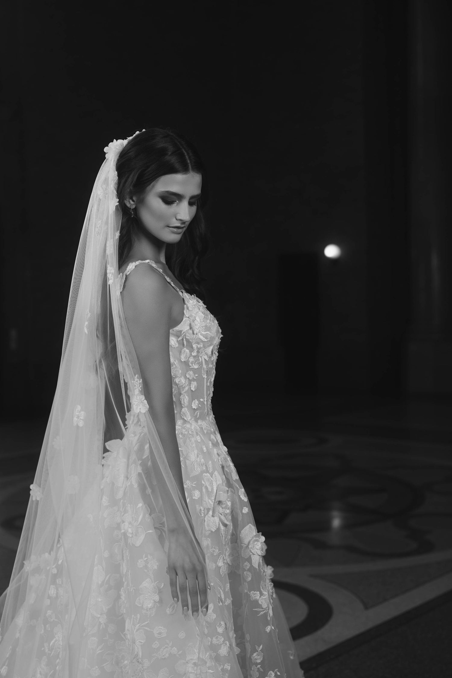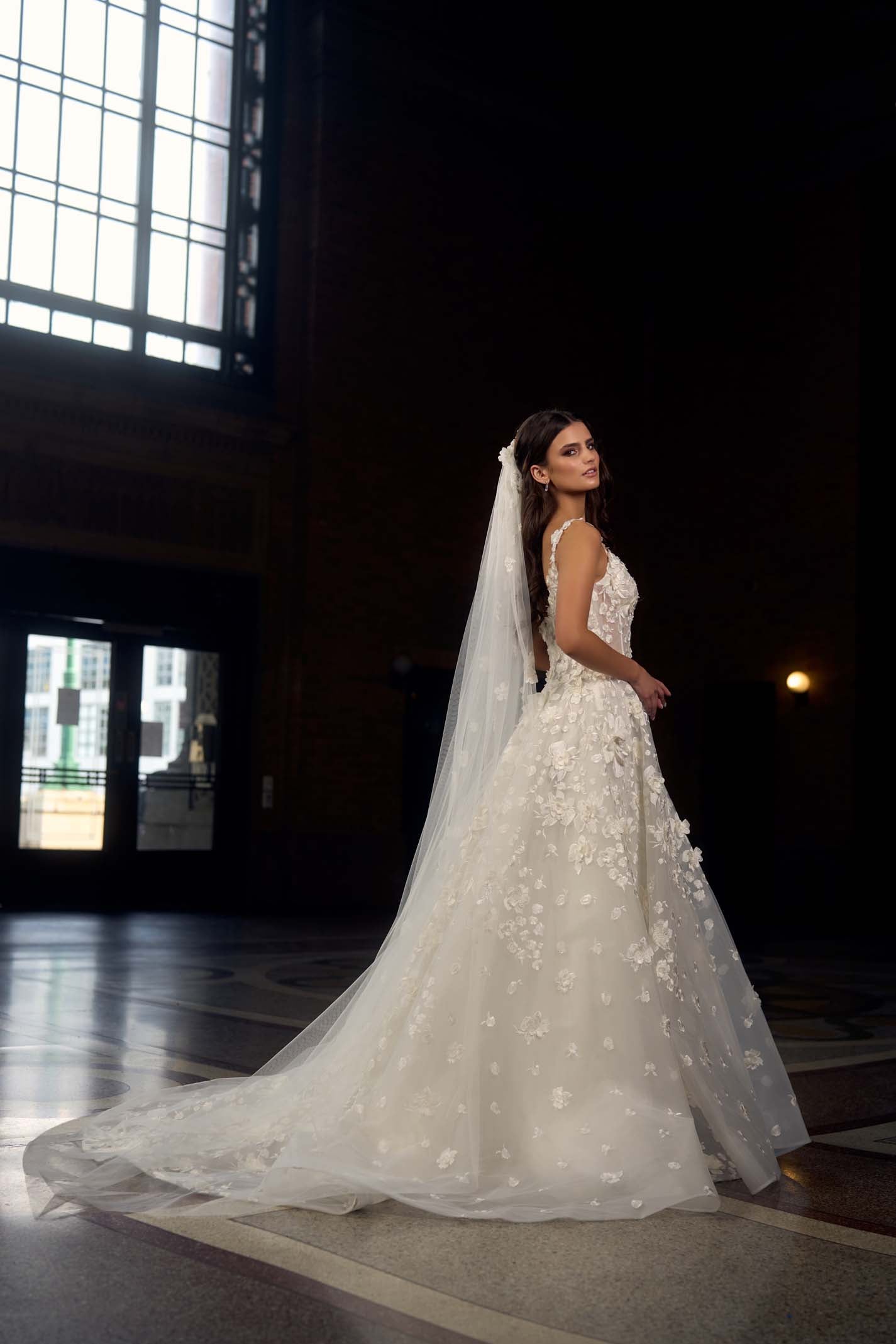 Look no further than our Abi gown if you're seeking a whimsical and captivating dress for your momentous day. Embellished with an intricate floral bodice that presents a sweetheart neckline, complemented by a feather-light A-line tulle skirt. Abi also unveils a train adorned with three-dimensional lace flowers, adding an extra touch of romanticism and beauty.