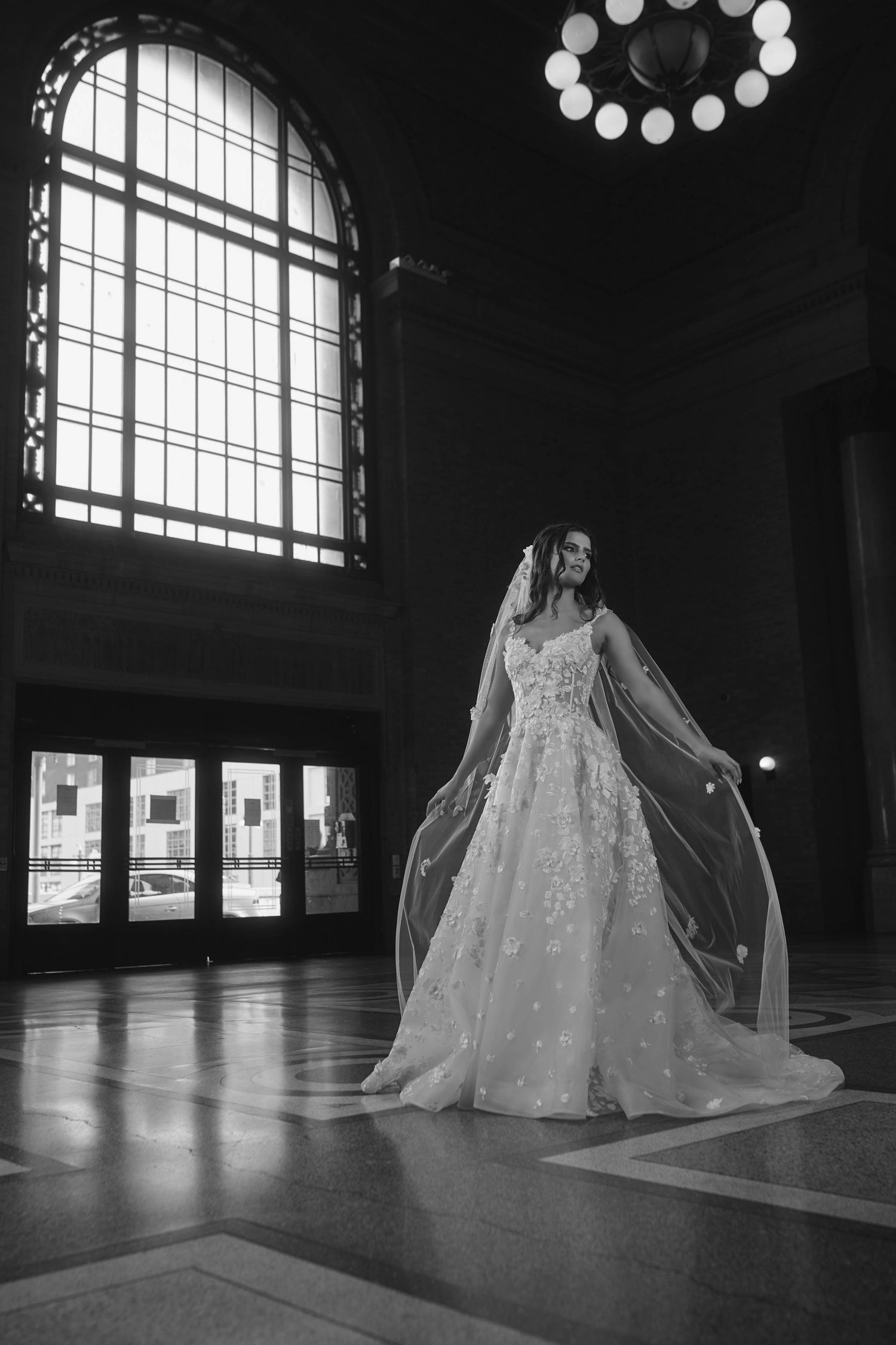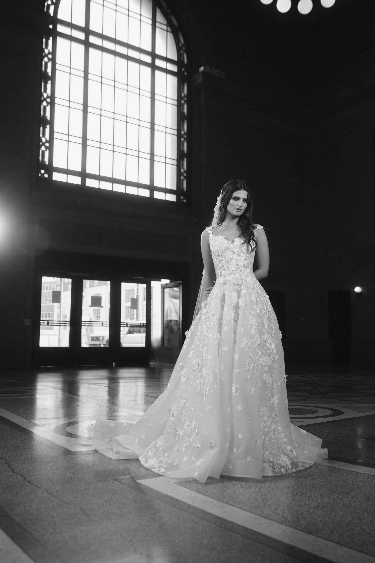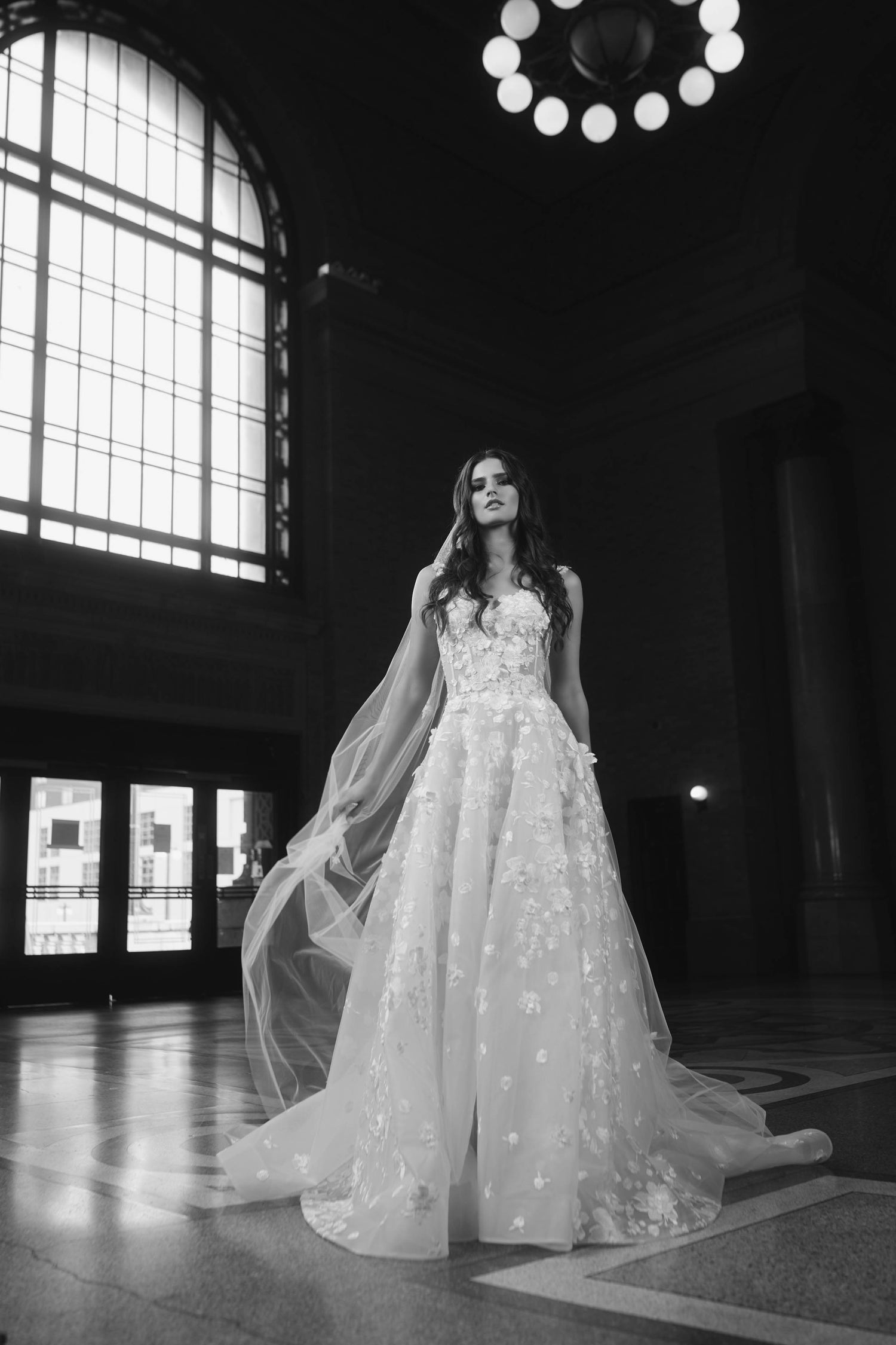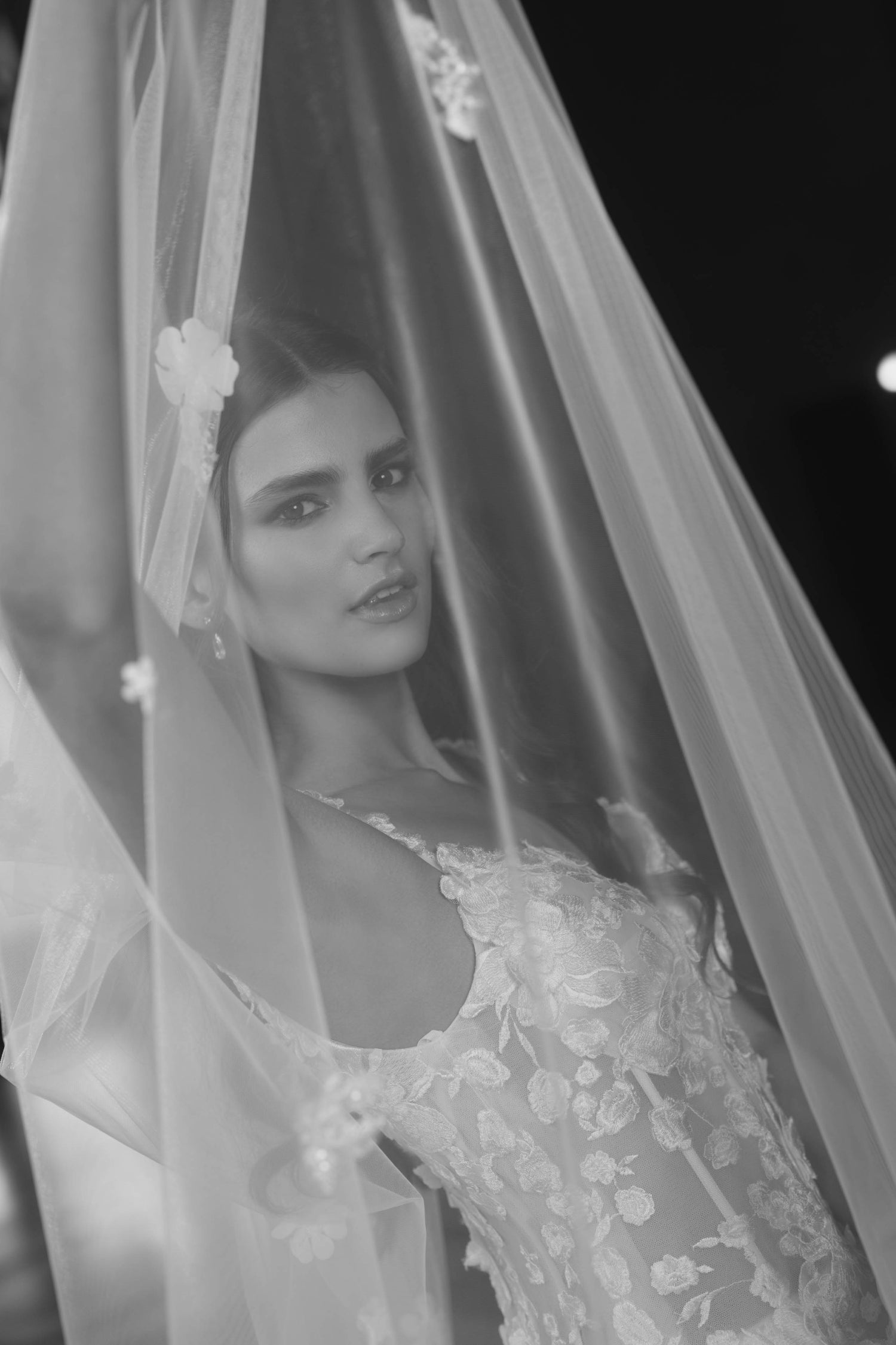 Look no further than our Abi gown if you're seeking a whimsical and captivating dress for your momentous day. Embellished with an intricate floral bodice that presents a sweetheart neckline, complemented by a feather-light A-line tulle skirt. Abi also unveils a train adorned with three-dimensional lace flowers, adding an extra touch of romanticism and beauty.