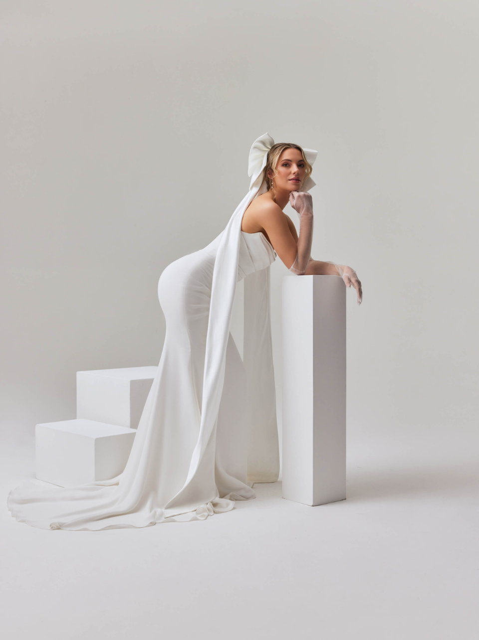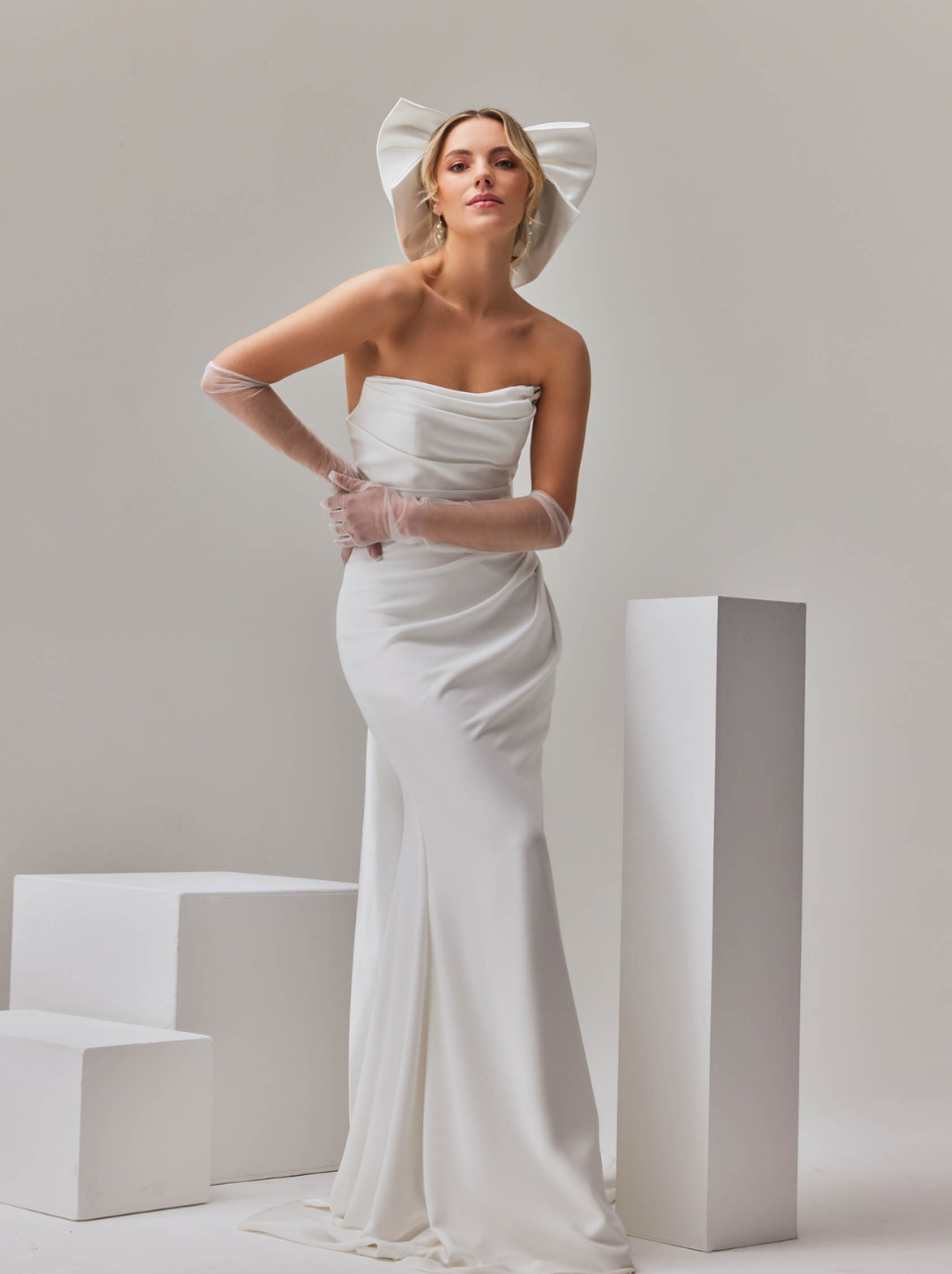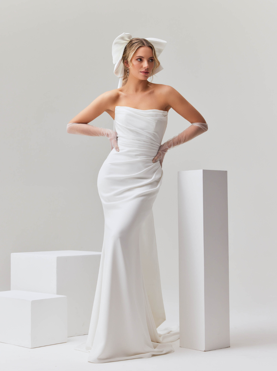 Minimal elegance in dress form.Our Alex gown is a beautifully draped minimal dress with ruching that flatters the figure. The cat-eye cut of the bodice accentuates the hour-glass silhouette, while the structured corset ensures the waist is cinched. Alex comes with detachable draped off-the-shoulder sleeves.