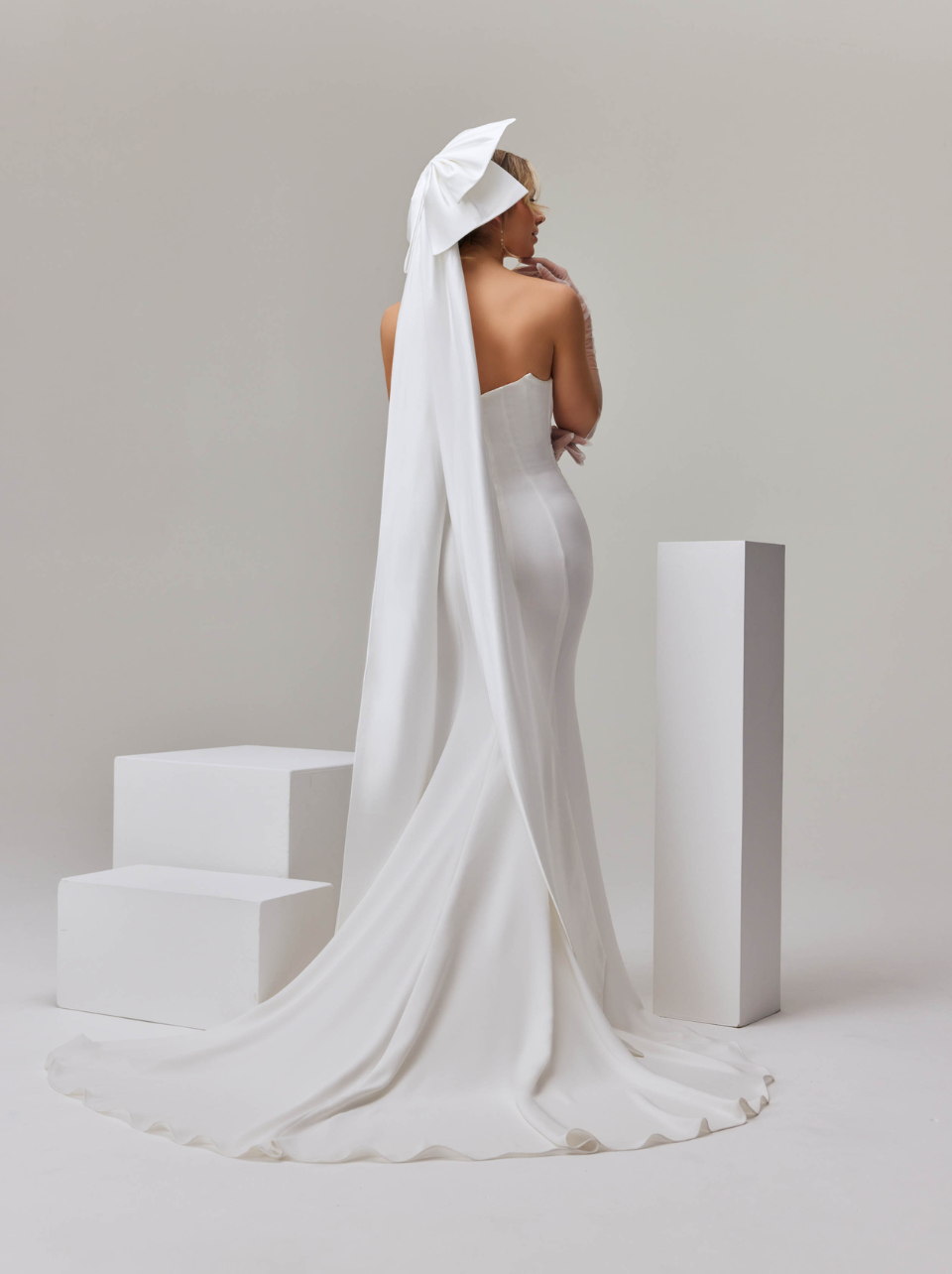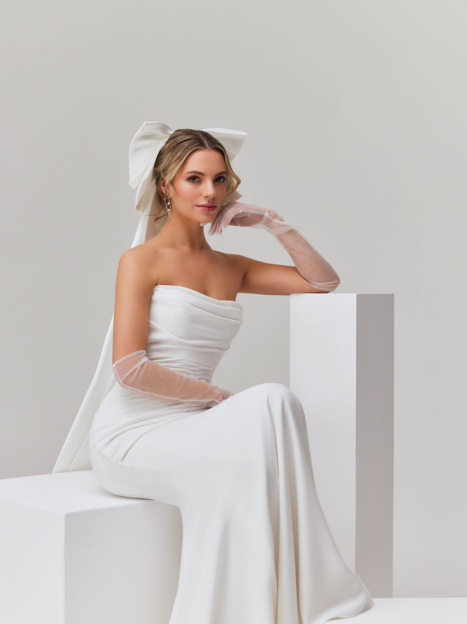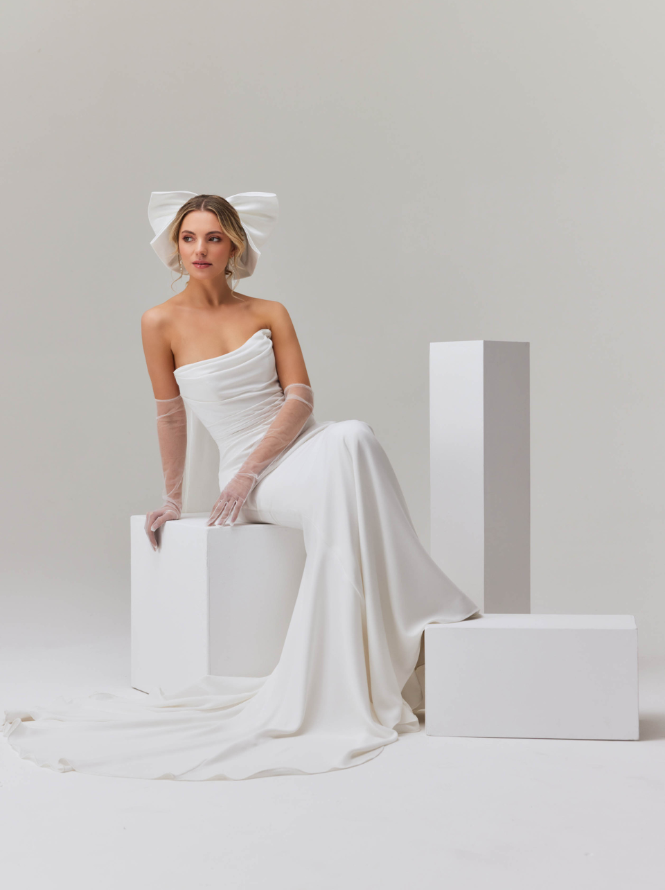Minimal elegance in dress form.Our Alex gown is a beautifully draped minimal dress with ruching that flatters the figure. The cat-eye cut of the bodice accentuates the hour-glass silhouette, while the structured corset ensures the waist is cinched. Alex comes with detachable draped off-the-shoulder sleeves.