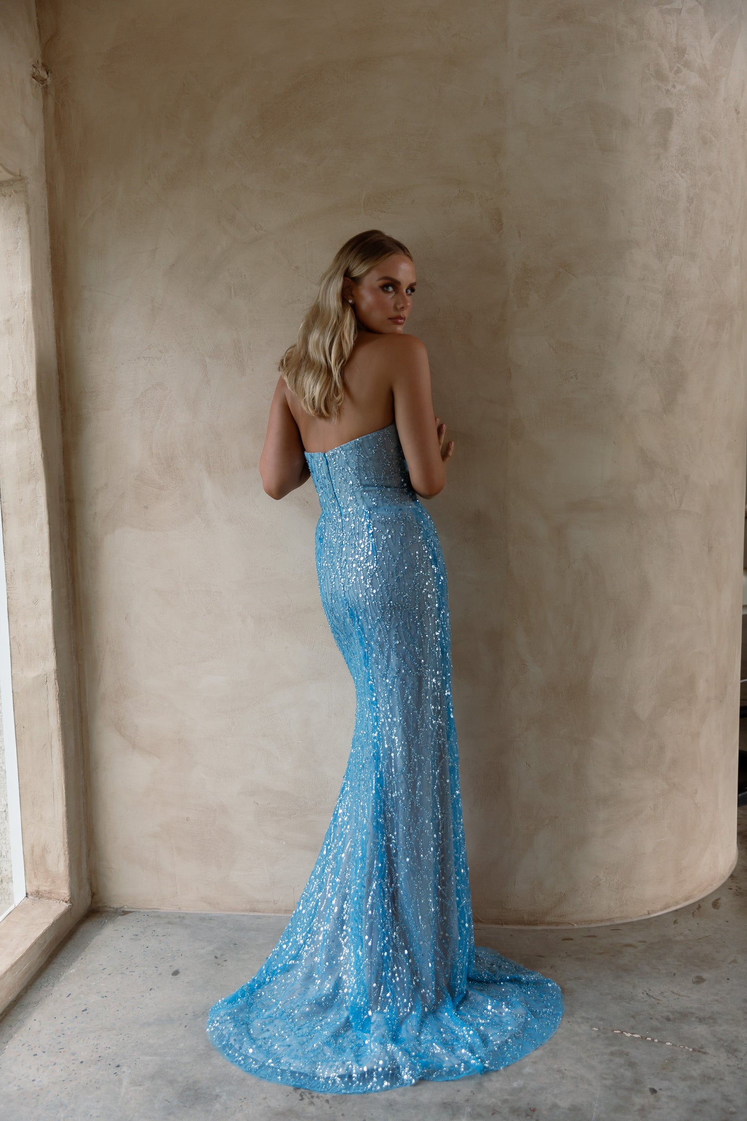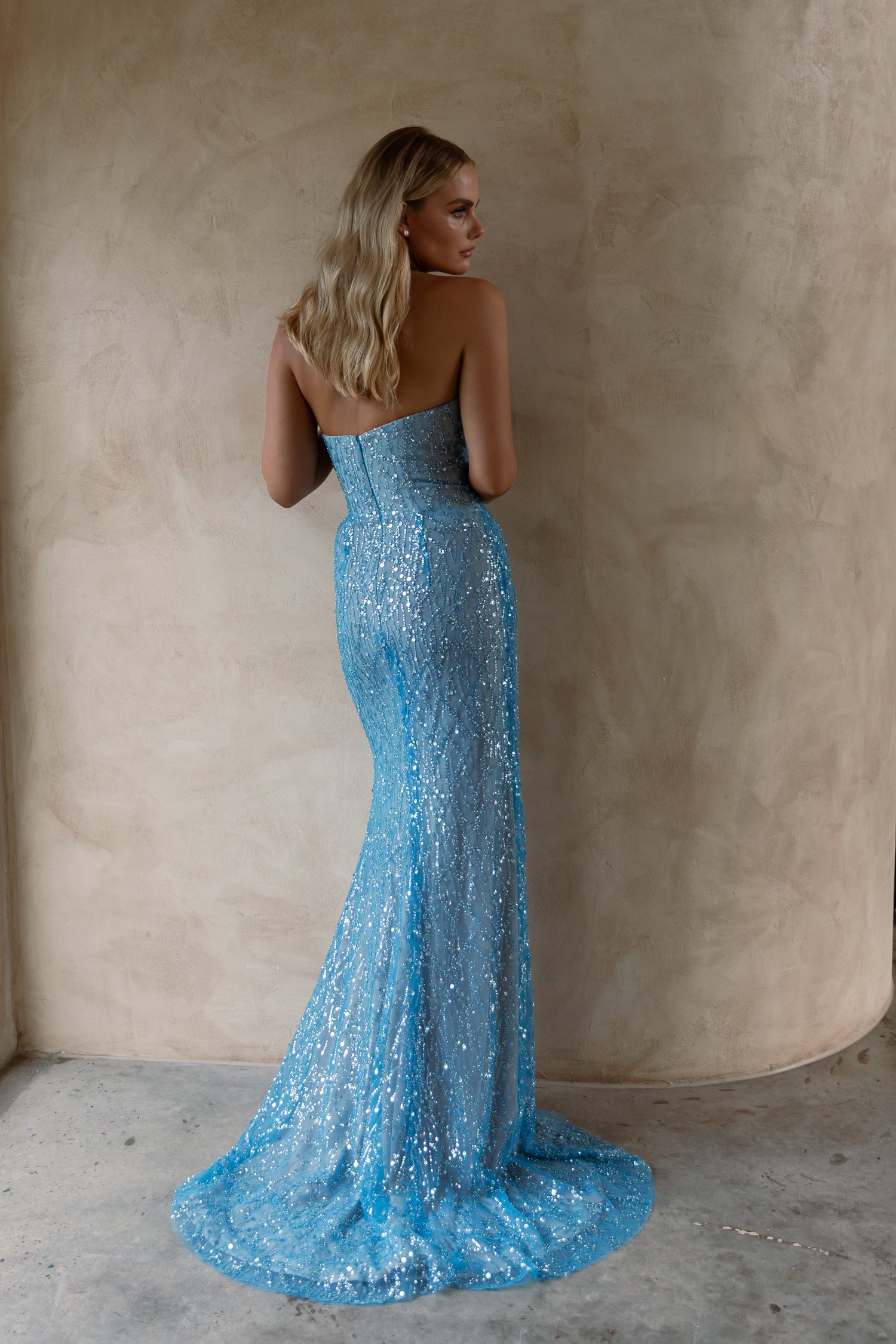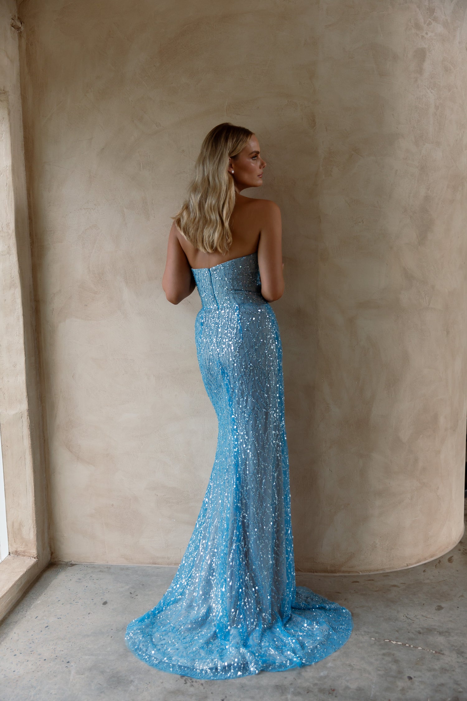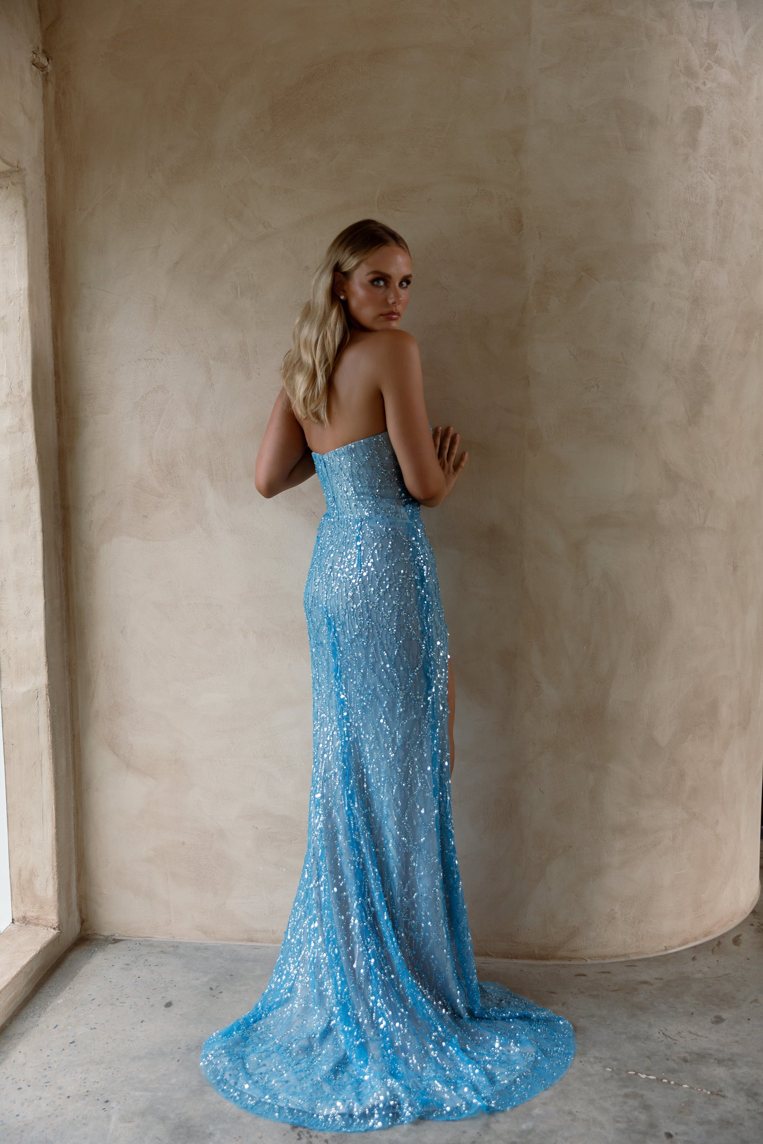 Elevate your evening look with the Amos Formal Dress, featuring a fitted silhouette and an eye-catching asymmetric strapless neckline. Its nude lining beautifully showcases the intricate details, while the daring high-leg split adds both movement and allure. Designed with an invisible back zip for a seamless finish, this dress captures modern elegance, perfect for galas, red carpets, and unforgettable nights. Step into effortless glamour and make a stunning statement wherever you go.
