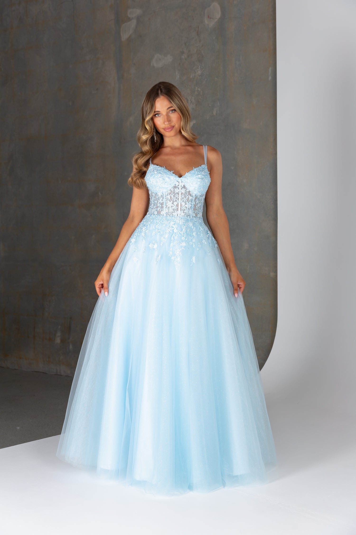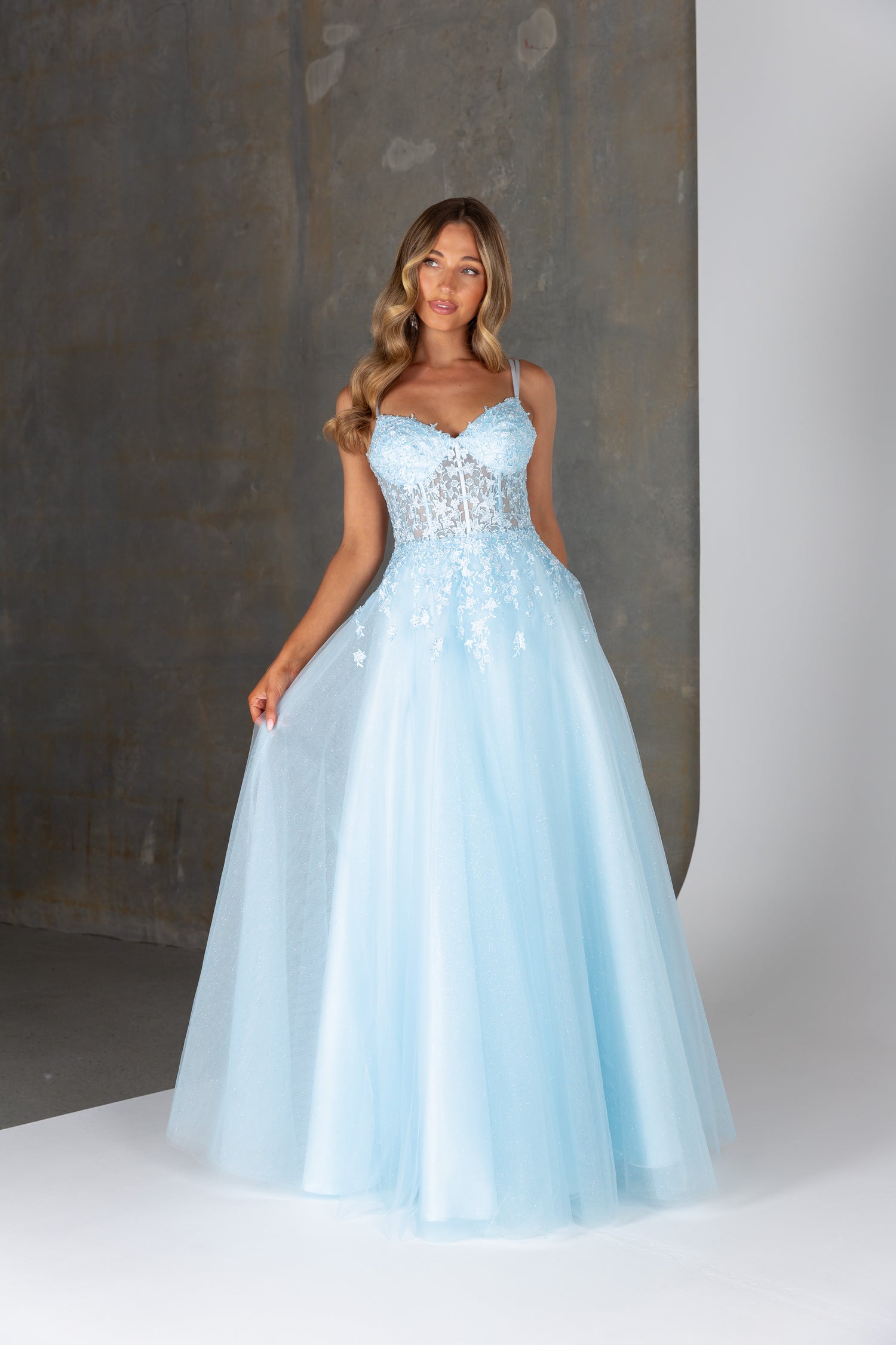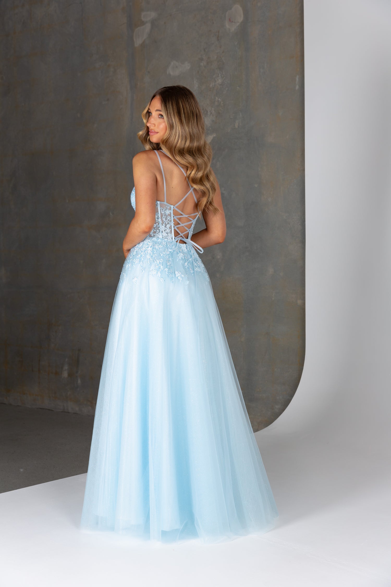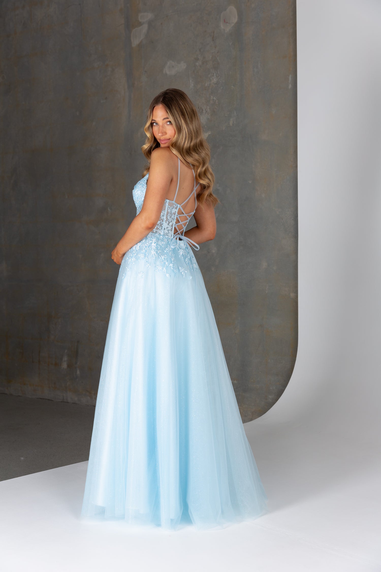 The Angelite dress by Tania Olsen Designs combines delicate charm with modern elegance. Featuring a V-neckline and adjustable lace-up spaghetti straps, it offers a flattering, custom fit. The illusion corset bodice with boning provides support while highlighting intricate lace details, complemented by built-in bra cups for comfort. Flowing into a full-length A-line skirt, this gown creates a graceful silhouette perfect for formal events, school balls, or black-tie occasions. An invisible back zipper ensures a sleek finish, making Angelite a stunning choice for your special night.