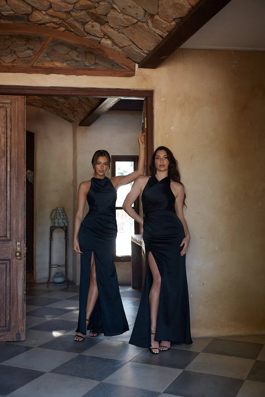The Anna bridesmaids dress combines timeless elegance with modern sophistication. Made from luxurious light satin, it features a high neckline with a graceful cowl drape and a striking mid-low keyhole back that adds subtle allure. The fitted skirt, enhanced with pleated detailing, flatters every figure while adding texture and movement. Designed to make your bridesmaids feel confident and radiant, the Anna dress perfectly complements your wedding’s style and vision.
