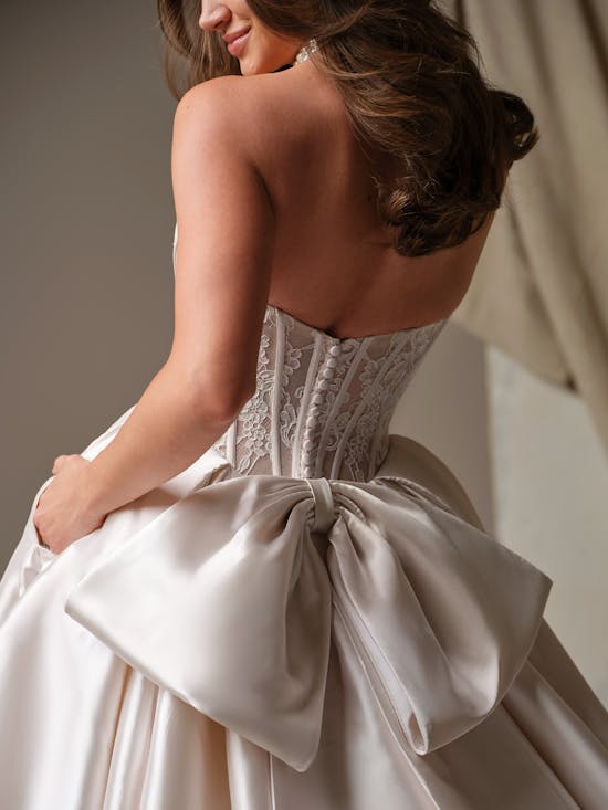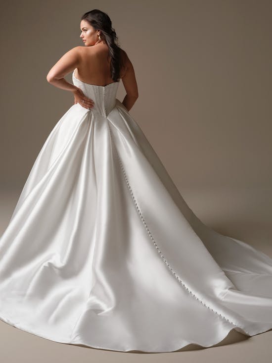 The Ashland gown showcases timeless elegance with its luxurious Elin stretch Mikado fabric, offering a flattering silhouette that moves beautifully. The sheer organza bodice features intricate Chantilly lace and striking exposed boning details that create a sophisticated focal point. A strapless V-neckline provides a modern, refined look, while the environmentally conscious Kahili recycled content lining ensures comfort without compromise. The elegant zipper closure, adorned with covered buttons trailing to the hem, adds a polished finishing touch. Perfect for the bride seeking understated luxury and sustainable style.