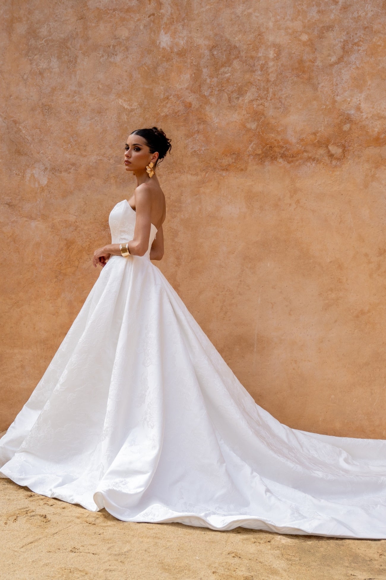 Step into your modern fairytale with Astrid, an A-line masterpiece that commands attention. The striking cat-eye neckline pairs beautifully with a voluminous, pleated skirt, creating a bridal silhouette that's bold yet perfectly balanced. Intricate floral Jacquard detailing sweeps across the ivory fabric, ensuring every angle tells a story of elegance. Astrid is crafted for the bride who refuses to compromise between timeless sophistication and contemporary edge—a gown that celebrates your individuality while honouring bridal tradition.