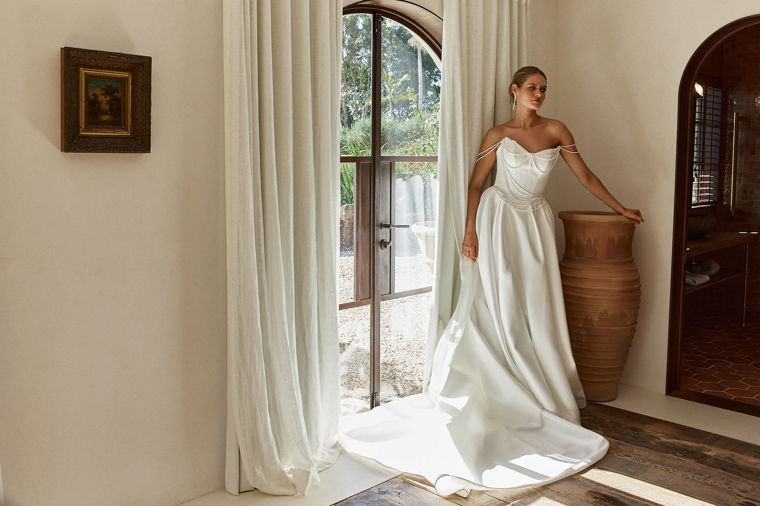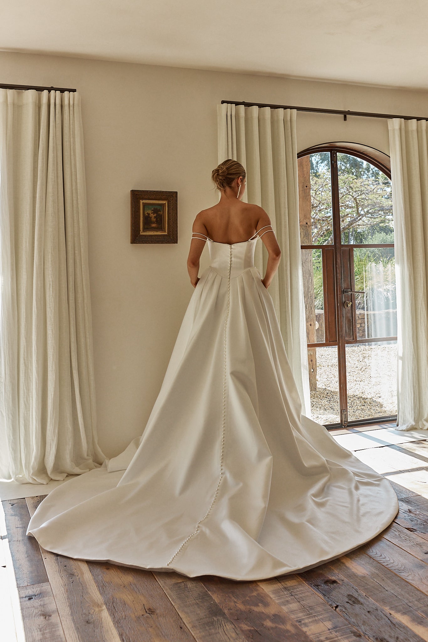 The Brynn wedding dress is a stunning Mikado ball gown designed to make you feel like royalty on your special day. This masterpiece features a romantic off-the-shoulder silhouette with delicate pearl straps that gracefully frame your shoulders. The fitted bodice showcases peaked bust cups adorned with detachable pearl strings, creating an ethereal, luxurious look. A rounded basque waistline flatters your figure before flowing into a voluminous skirt with strategic pleating at the hips for added dimension and movement. The dramatic cathedral-length train commands attention as you walk down the aisle, while the concealed invisible zipper and cascading pearl button details along the back add sophisticated finishing touches. Perfect for the bride who desires timeless elegance with modern bridal glamour.