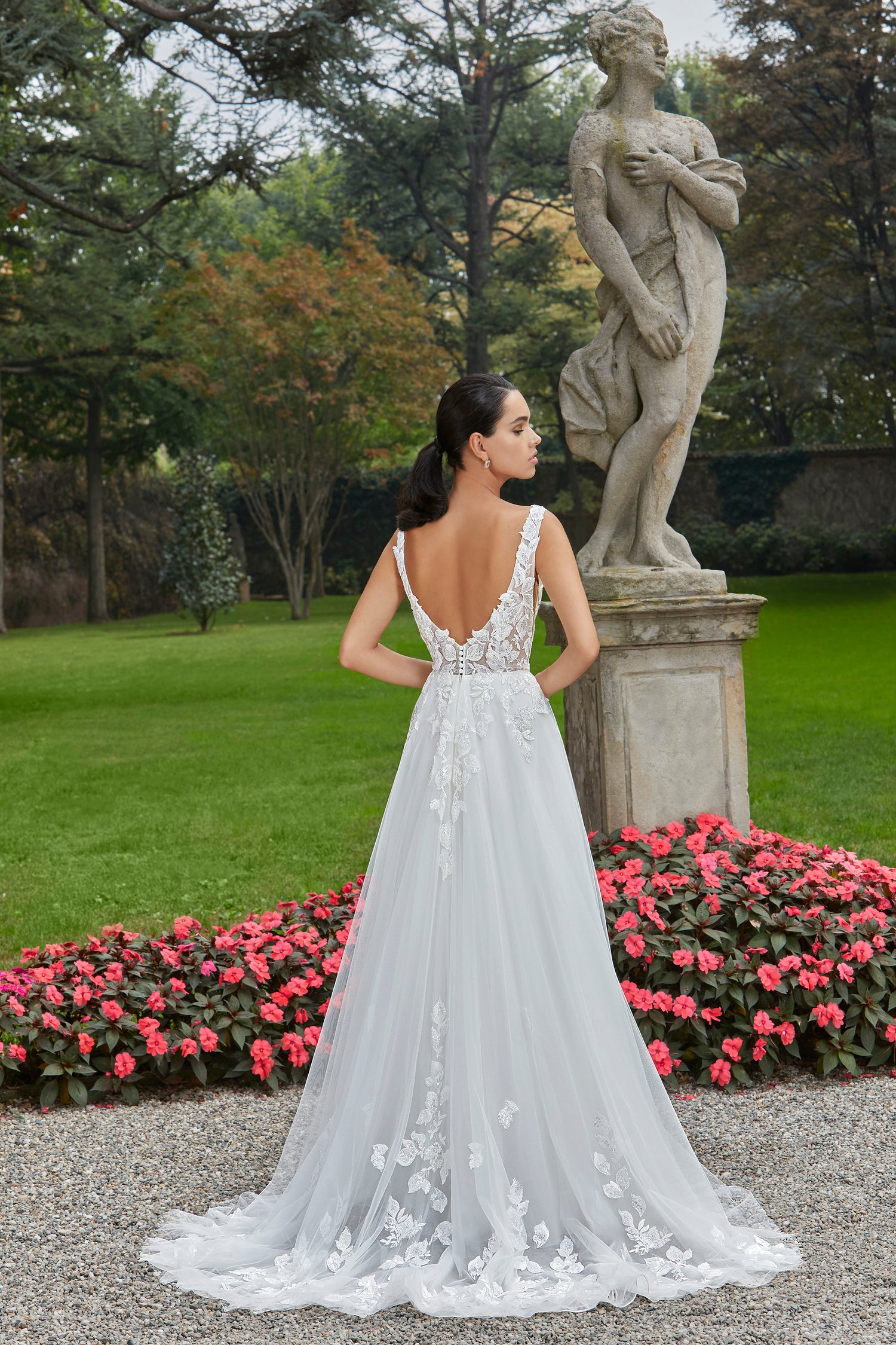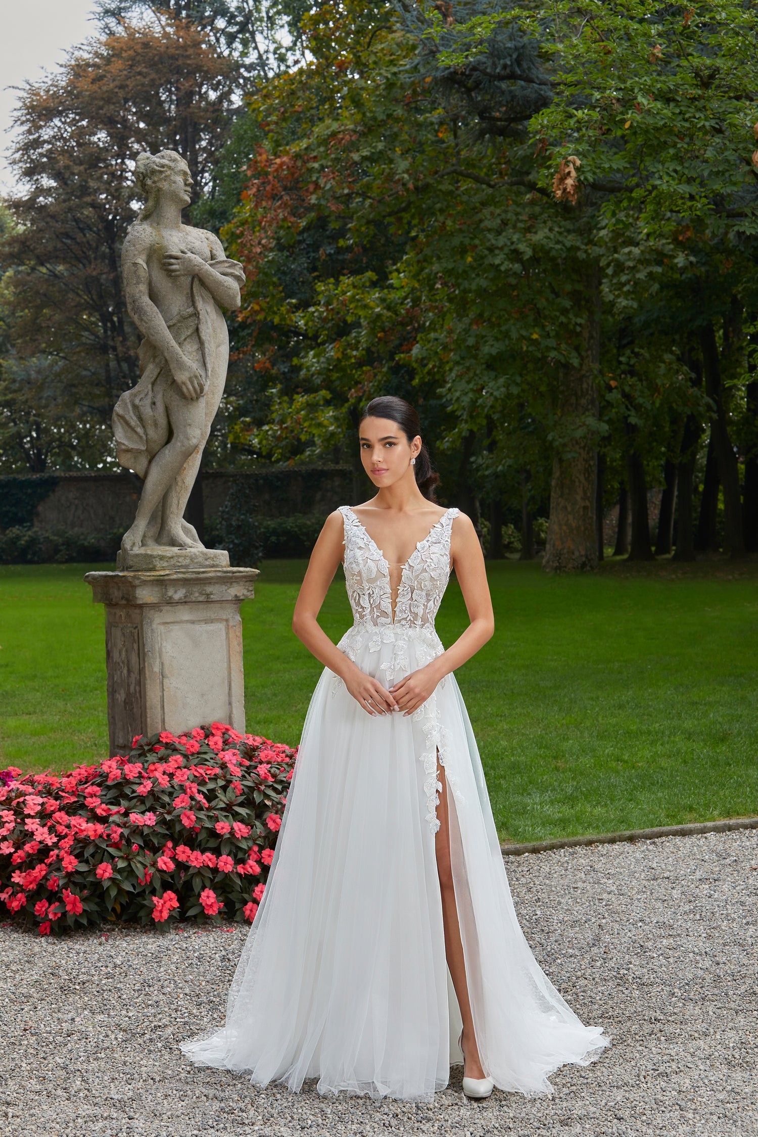 Cara is the perfect balance of romance and allure. This stunning style 8165 features a seductive plunging V-neck bodice paired with a daring low back that commands attention. Delicate embroidered floral lace adorns the bodice before flowing gracefully into a luxurious tulle skirt, complete with a thigh-high slit for effortless movement and undeniable elegance. Sensual yet sweetly feminine, Cara is designed for the bride who wants to feel confident, beautiful, and utterly captivating on her special day.