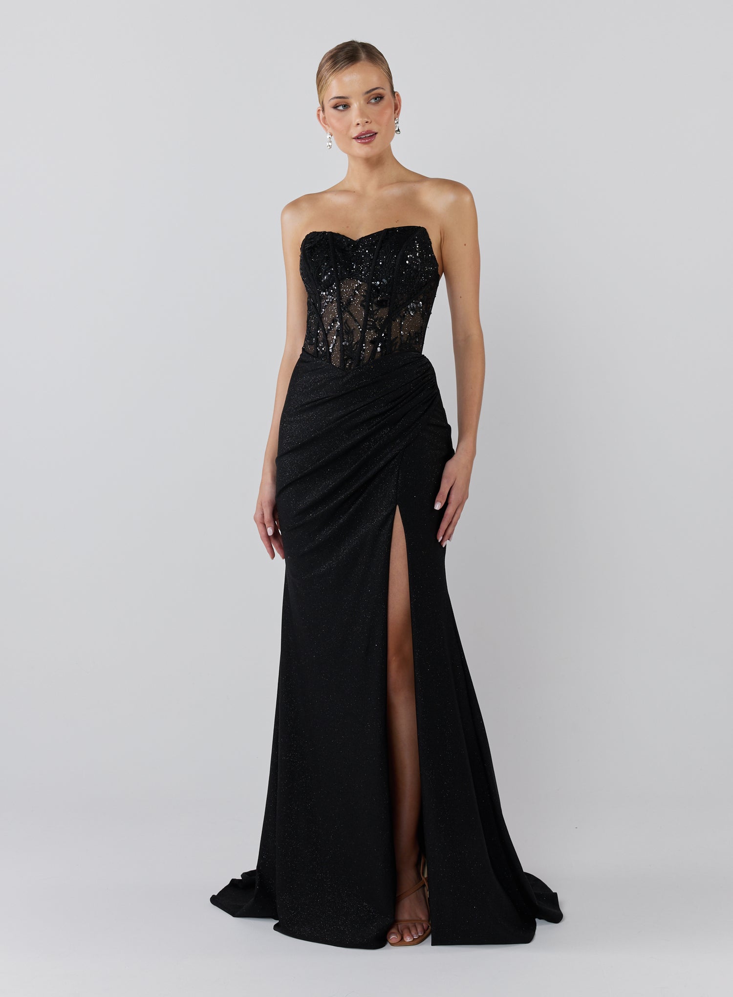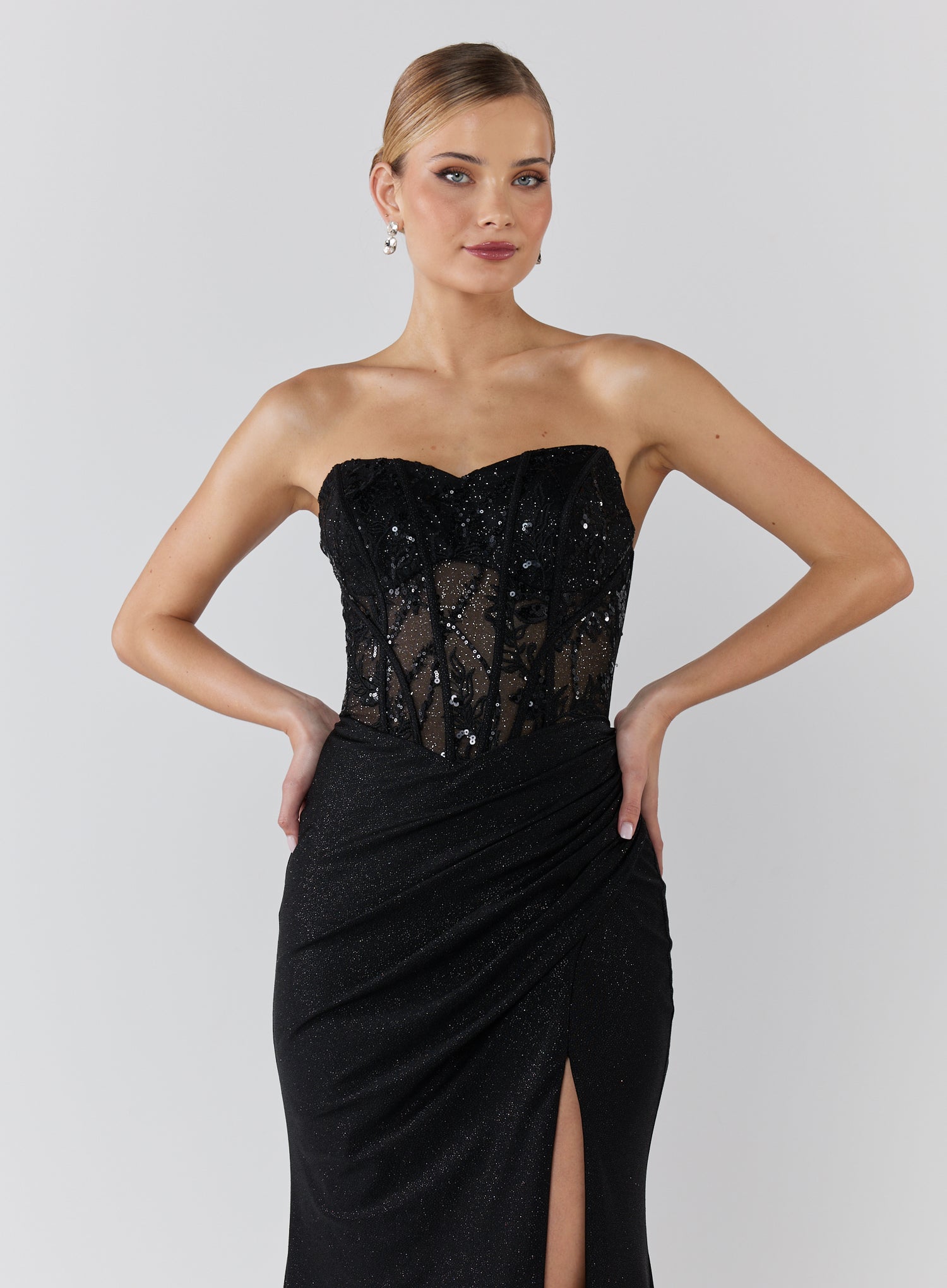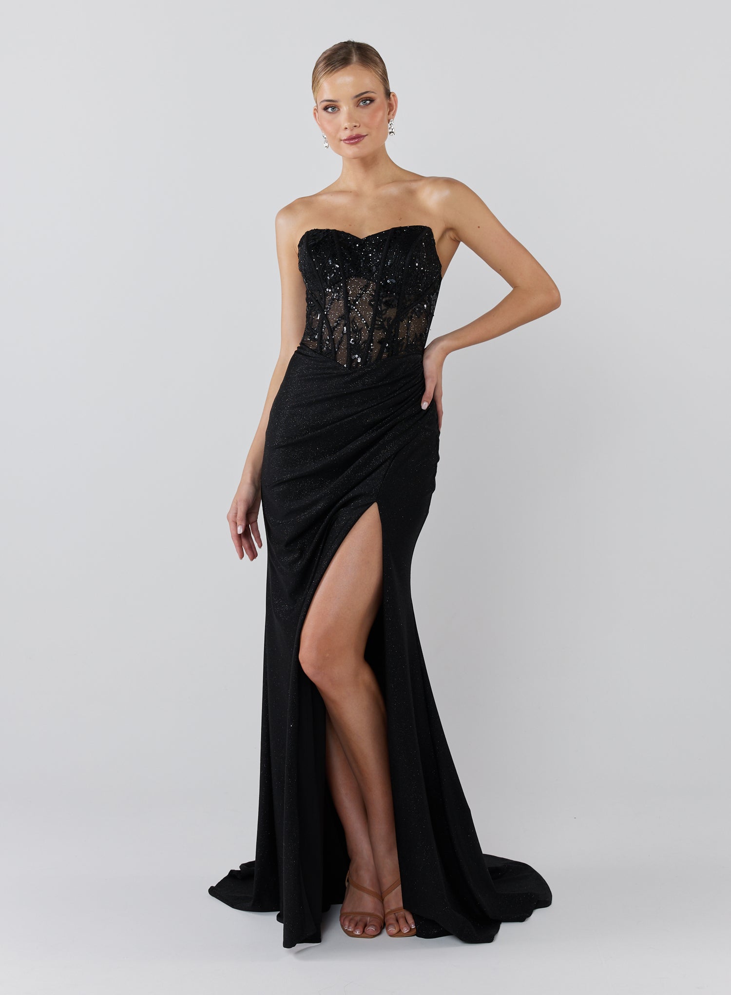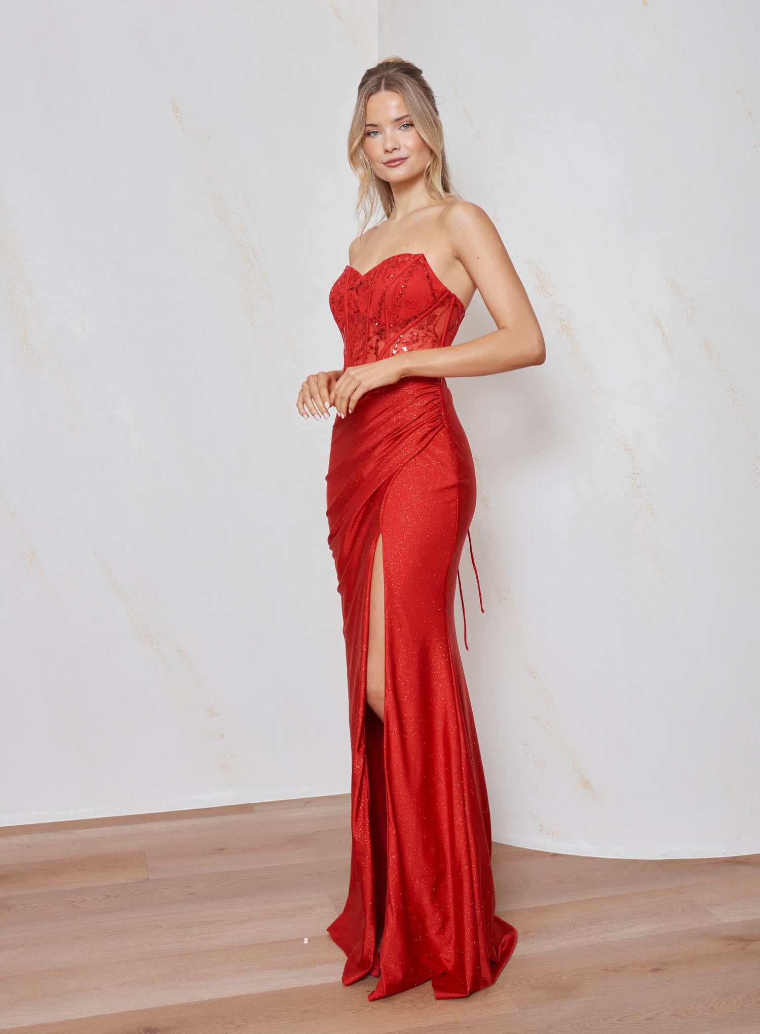 Introducing the Cherrie Formal Dress—where sophistication meets show-stopping glamour. This fitted floor-length gown features luxurious sparkle knit fabric that catches the light beautifully with every movement. The dramatic thigh-high split and asymmetrical hip gathers create an effortlessly flattering silhouette that moves with you. A sweetheart strapless neckline and delicate illusion sequin lace bodice deliver timeless elegance, while the structured drop basque waistline with exposed boning ensures a sculpted fit. The adjustable lace-up back provides a secure, customizable closure. Perfect for formal events, galas, or any occasion where you want to make an unforgettable impression.