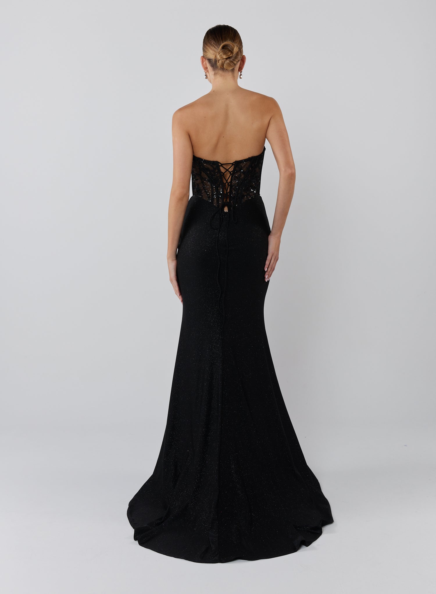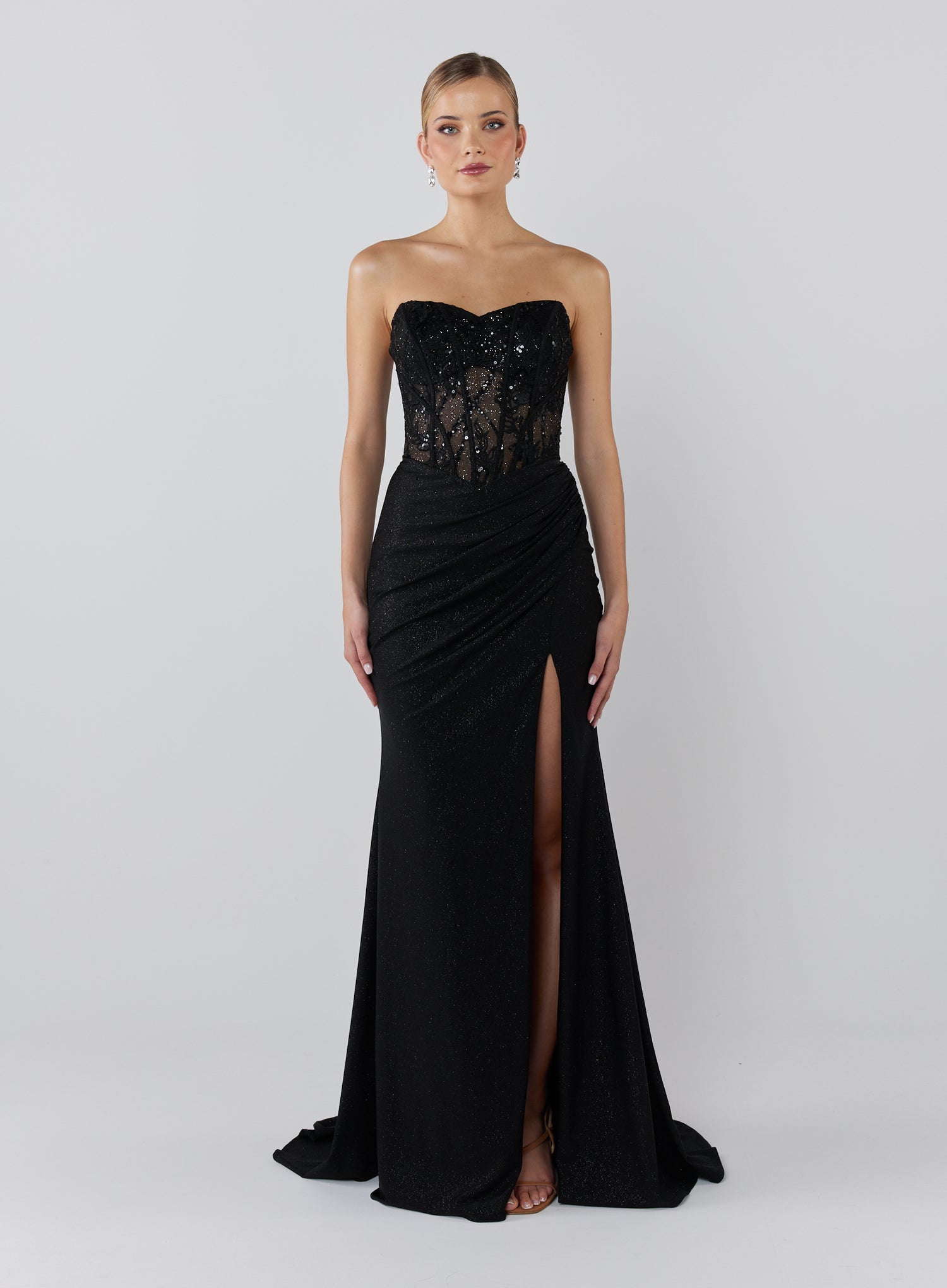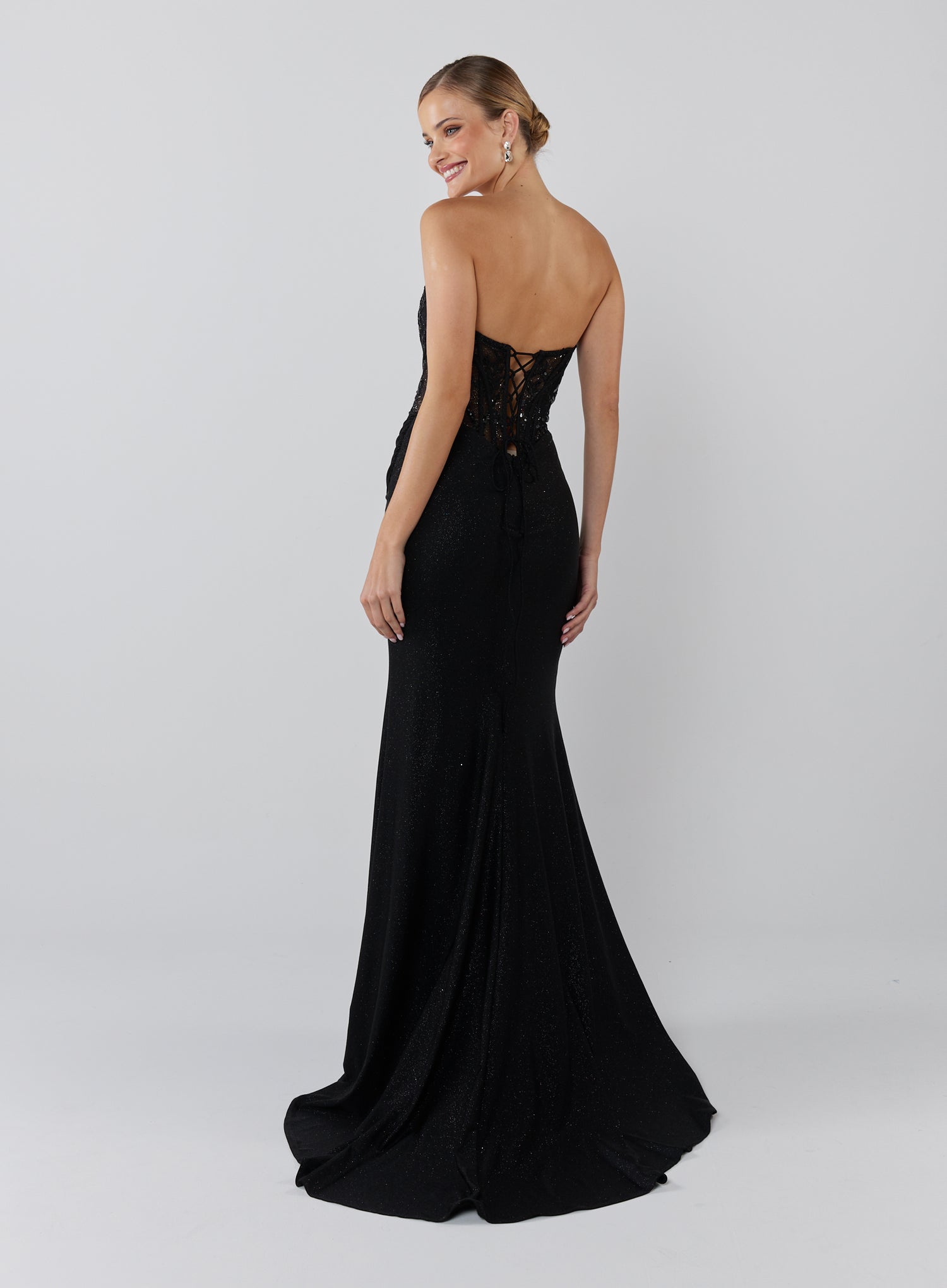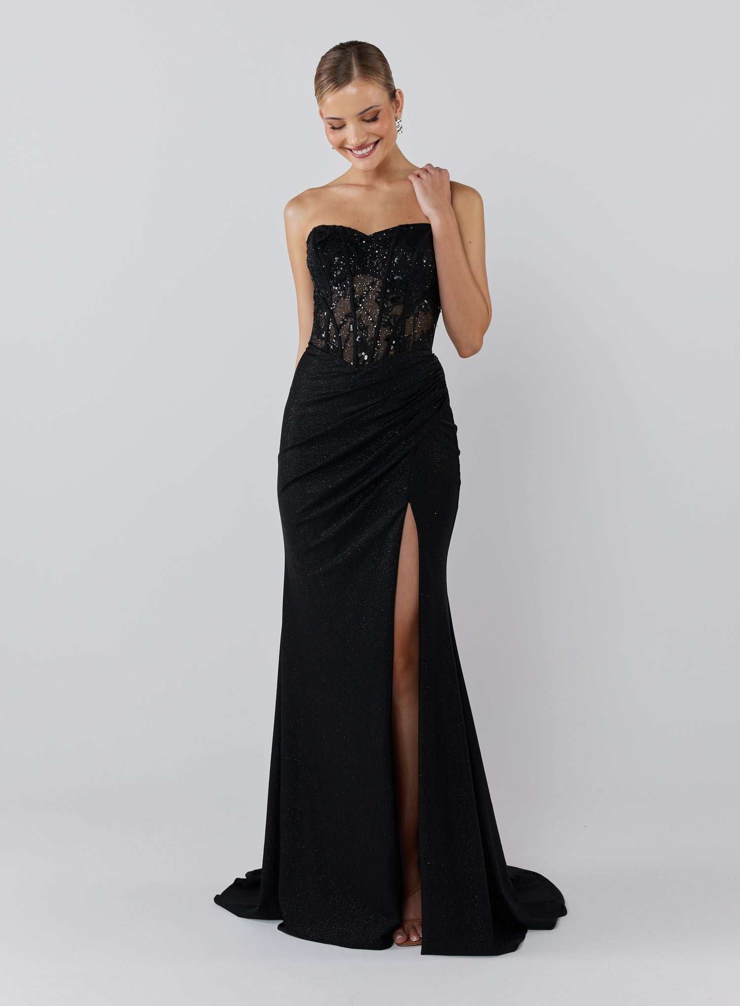 Introducing the Cherrie Formal Dress—where sophistication meets show-stopping glamour. This fitted floor-length gown features luxurious sparkle knit fabric that catches the light beautifully with every movement. The dramatic thigh-high split and asymmetrical hip gathers create an effortlessly flattering silhouette that moves with you. A sweetheart strapless neckline and delicate illusion sequin lace bodice deliver timeless elegance, while the structured drop basque waistline with exposed boning ensures a sculpted fit. The adjustable lace-up back provides a secure, customizable closure. Perfect for formal events, galas, or any occasion where you want to make an unforgettable impression.