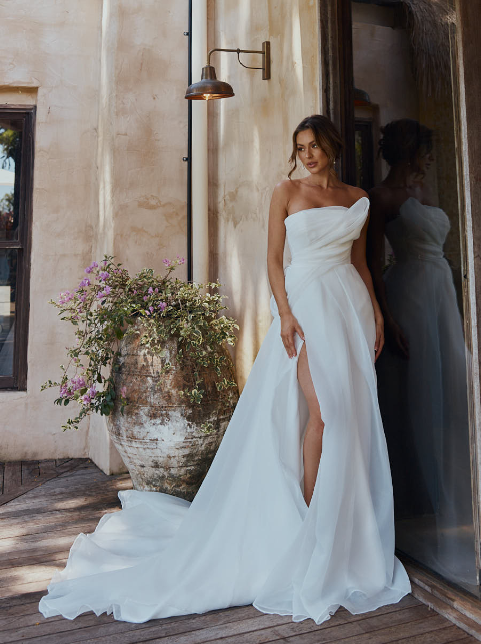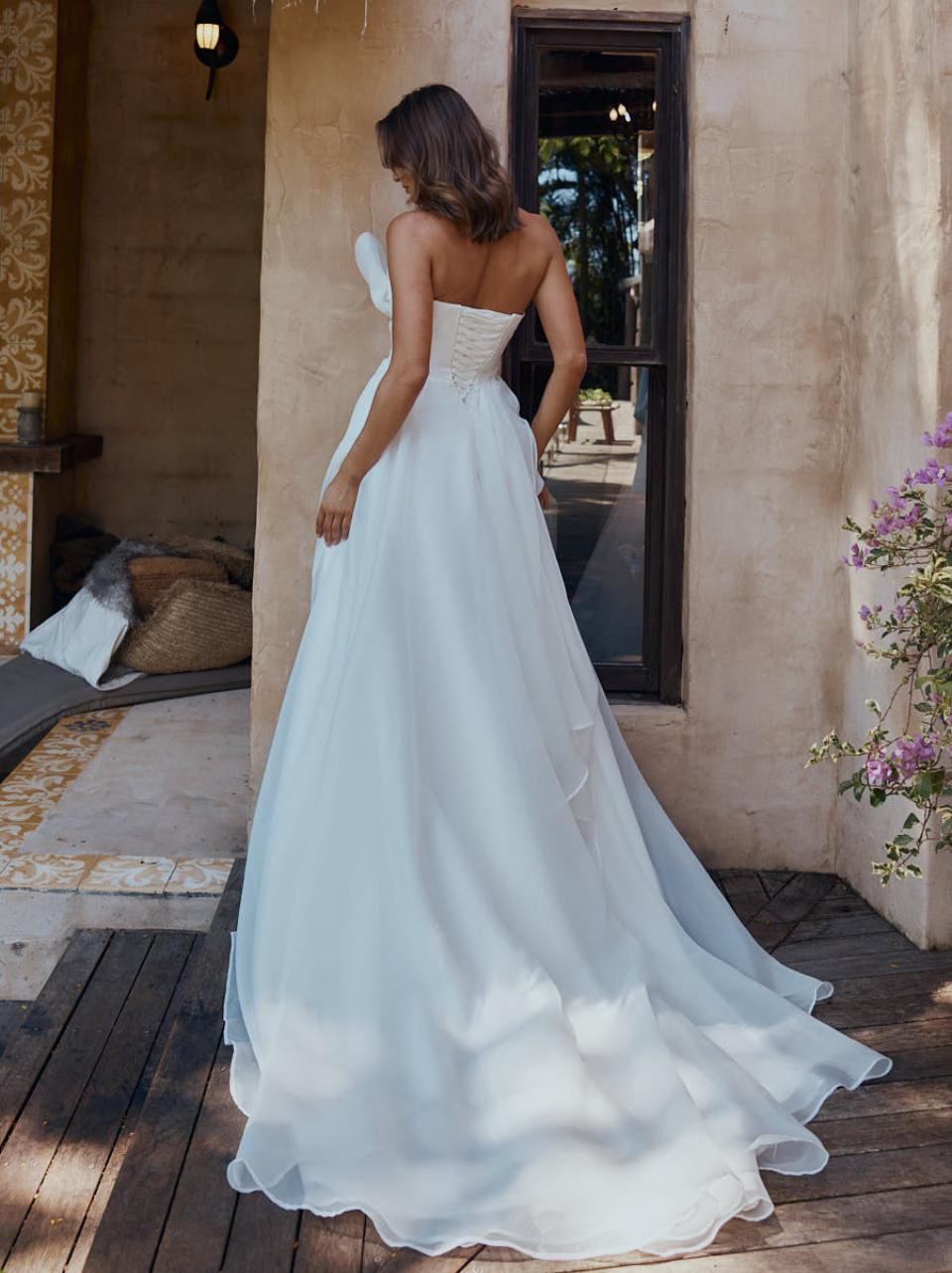 Experience the perfect blend of elegance and modernity with the Cora dress. Crafted from luxurious organza, its straight neckline is beautifully enhanced by a sweeping structured side detail that flows gracefully across the bodice and down the skirt. The A-line silhouette features a layered cross-over front skirt with a split and pleating, adding captivating movement and dimension. Designed for comfort and confidence, Cora includes inner bra cups, boning for support, and a lace-up back corset with a skirt zip closure, ensuring you look stunning and feel secure all night long.