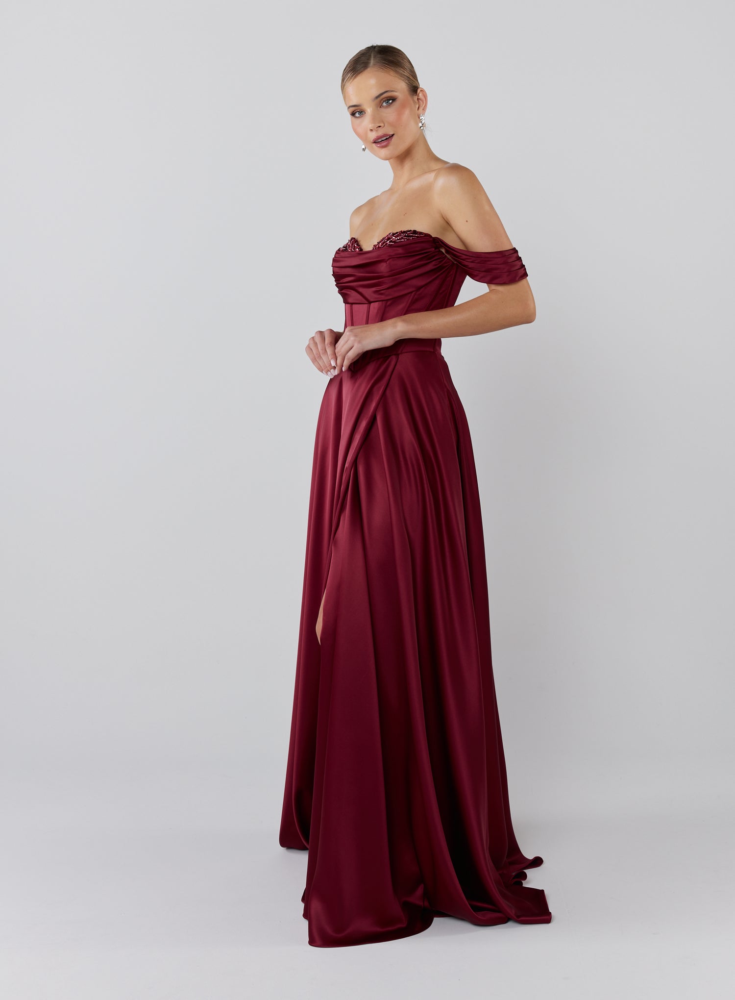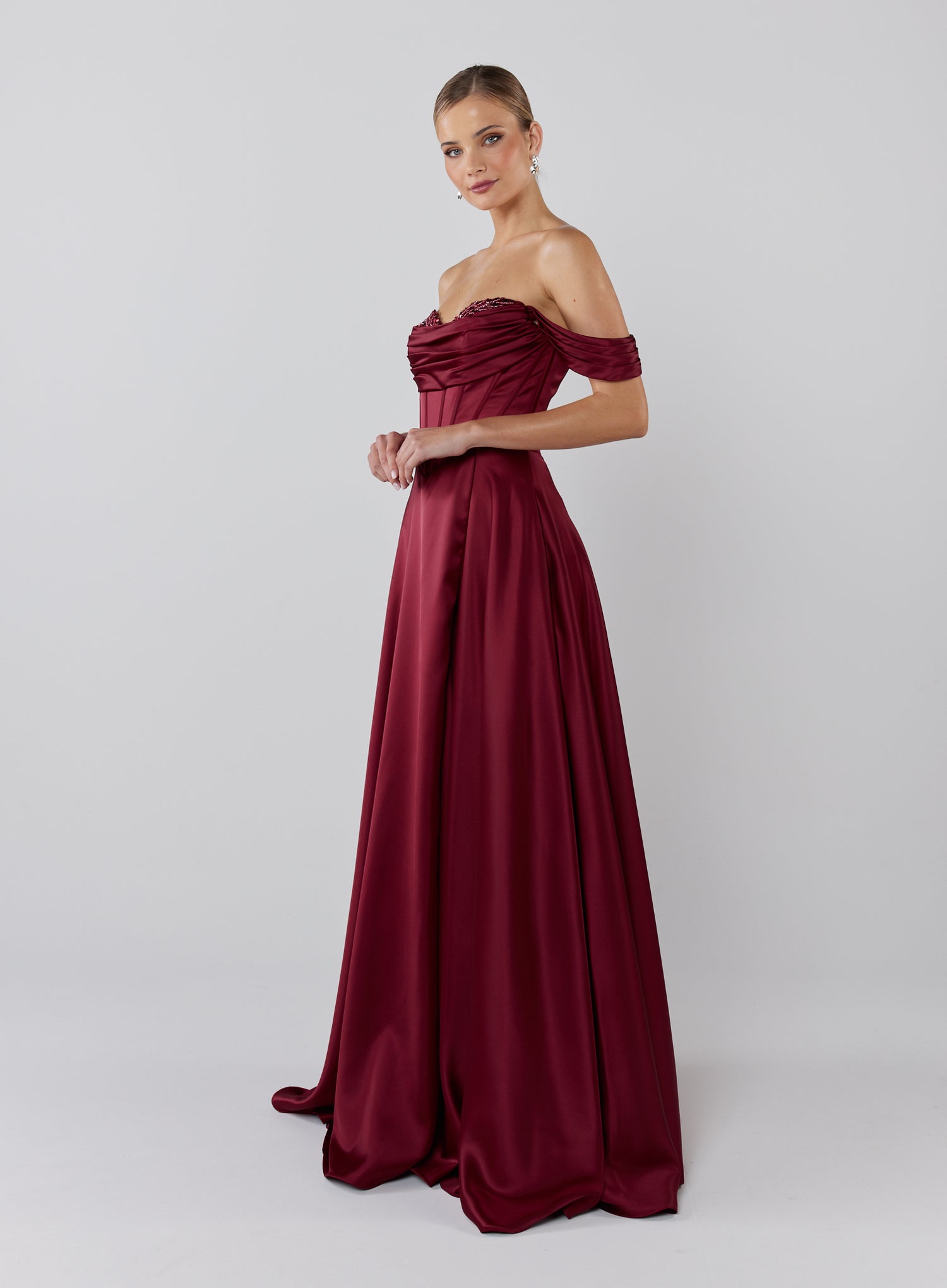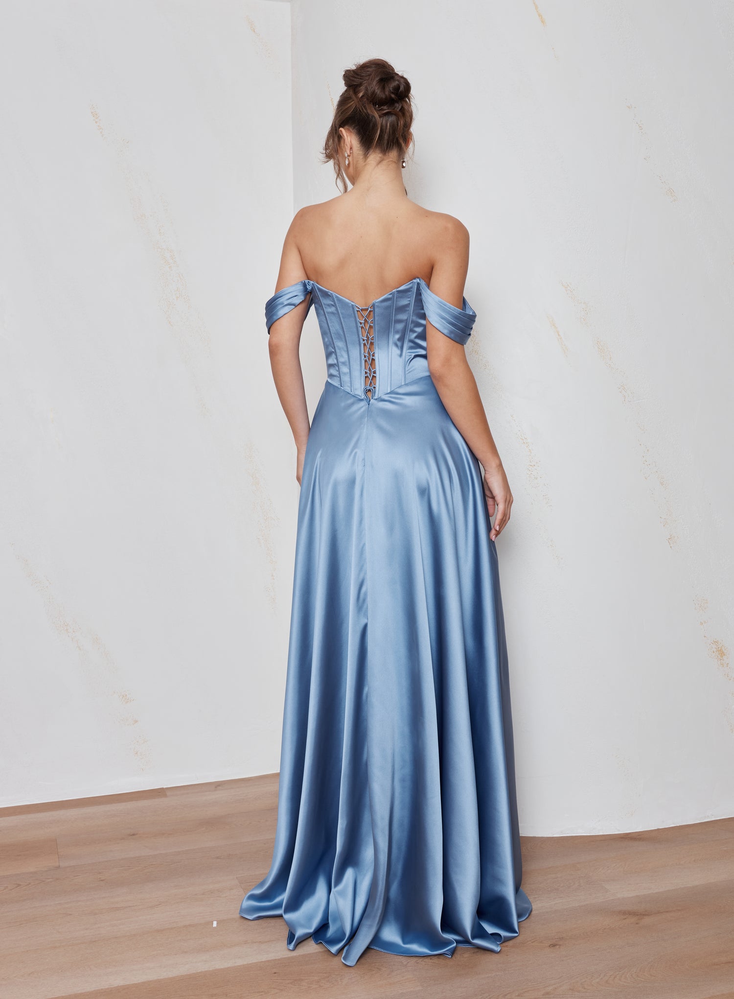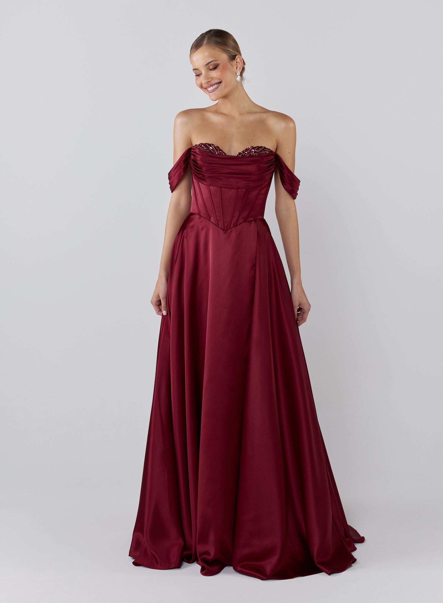 The Cosette Formal Dress epitomizes modern romance with its graceful A-line silhouette and luxurious satin fabric. Designed for the discerning bride, this gown features an elegant sweetheart neckline with peek-a-boo beaded bust cups and exposed boning for flattering structure. Off-the-shoulder pleated straps drape softly across the shoulders, while a strategic front split adds contemporary flair and practical movement. The adjustable lace-up back closure ensures a perfect fit, complemented by an invisible zipper for a seamless look. Timeless yet refreshingly modern, the Cosette delivers the sophisticated elegance every bride deserves.