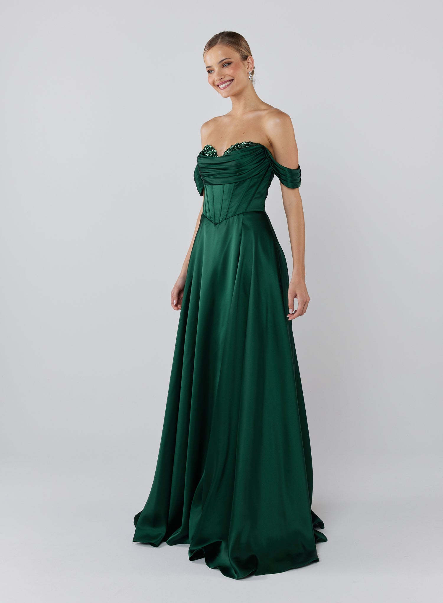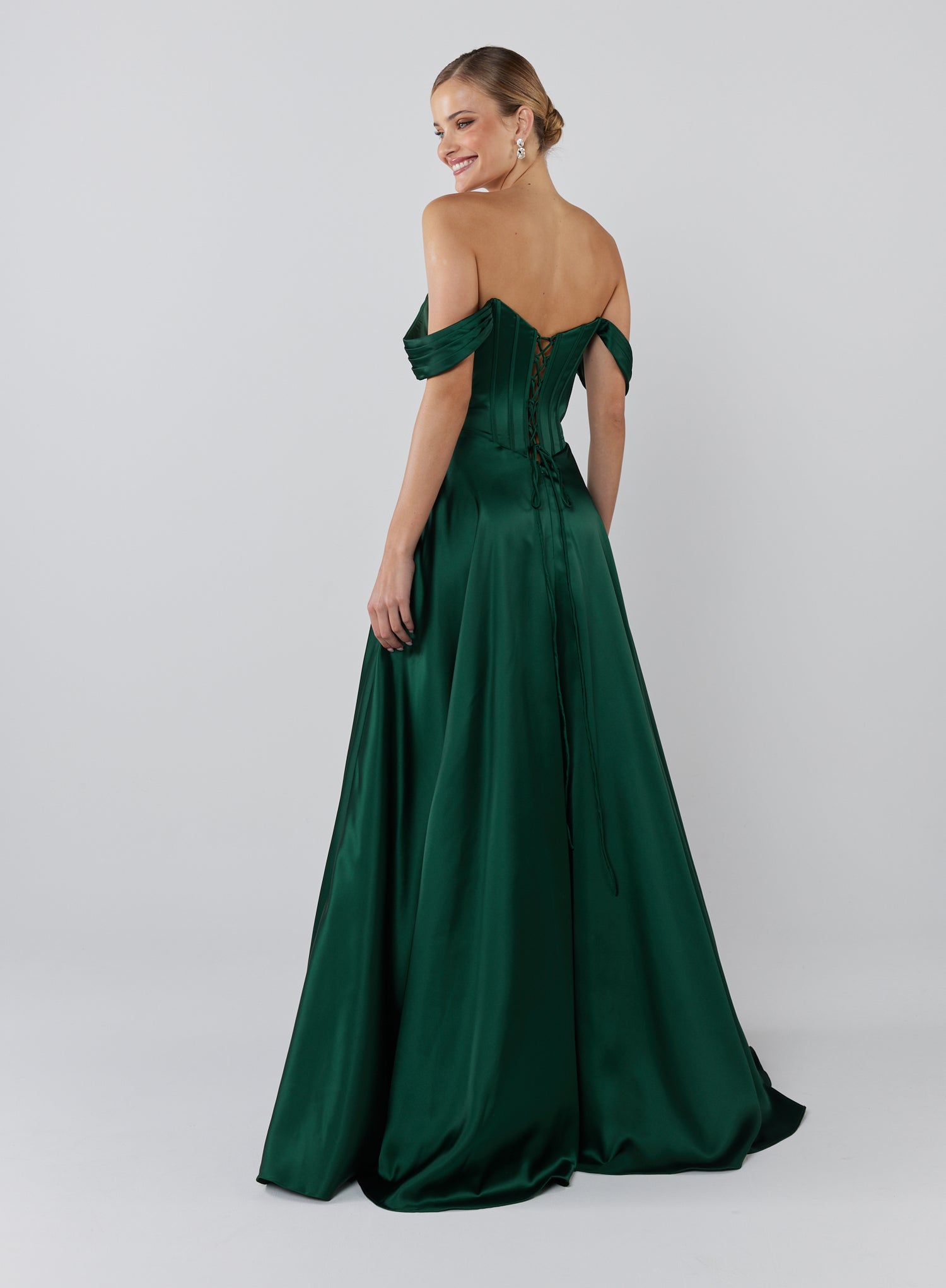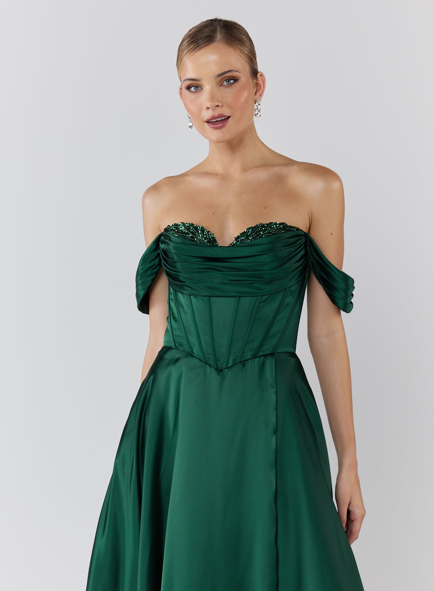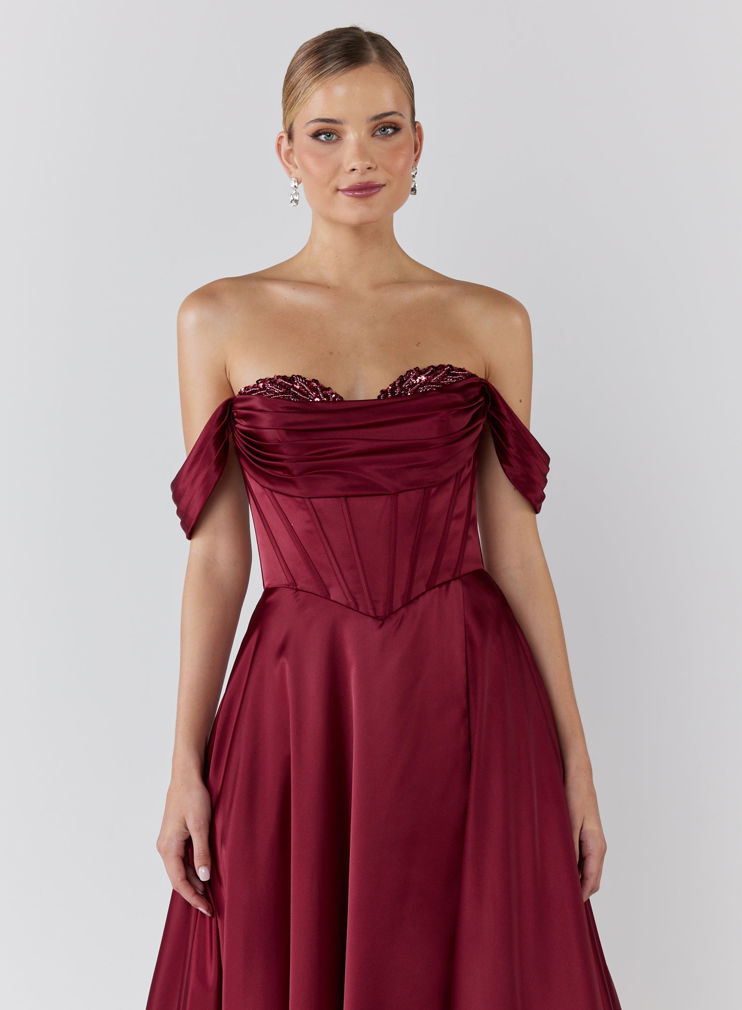 The Cosette Formal Dress epitomizes modern romance with its graceful A-line silhouette and luxurious satin fabric. Designed for the discerning bride, this gown features an elegant sweetheart neckline with peek-a-boo beaded bust cups and exposed boning for flattering structure. Off-the-shoulder pleated straps drape softly across the shoulders, while a strategic front split adds contemporary flair and practical movement. The adjustable lace-up back closure ensures a perfect fit, complemented by an invisible zipper for a seamless look. Timeless yet refreshingly modern, the Cosette delivers the sophisticated elegance every bride deserves.