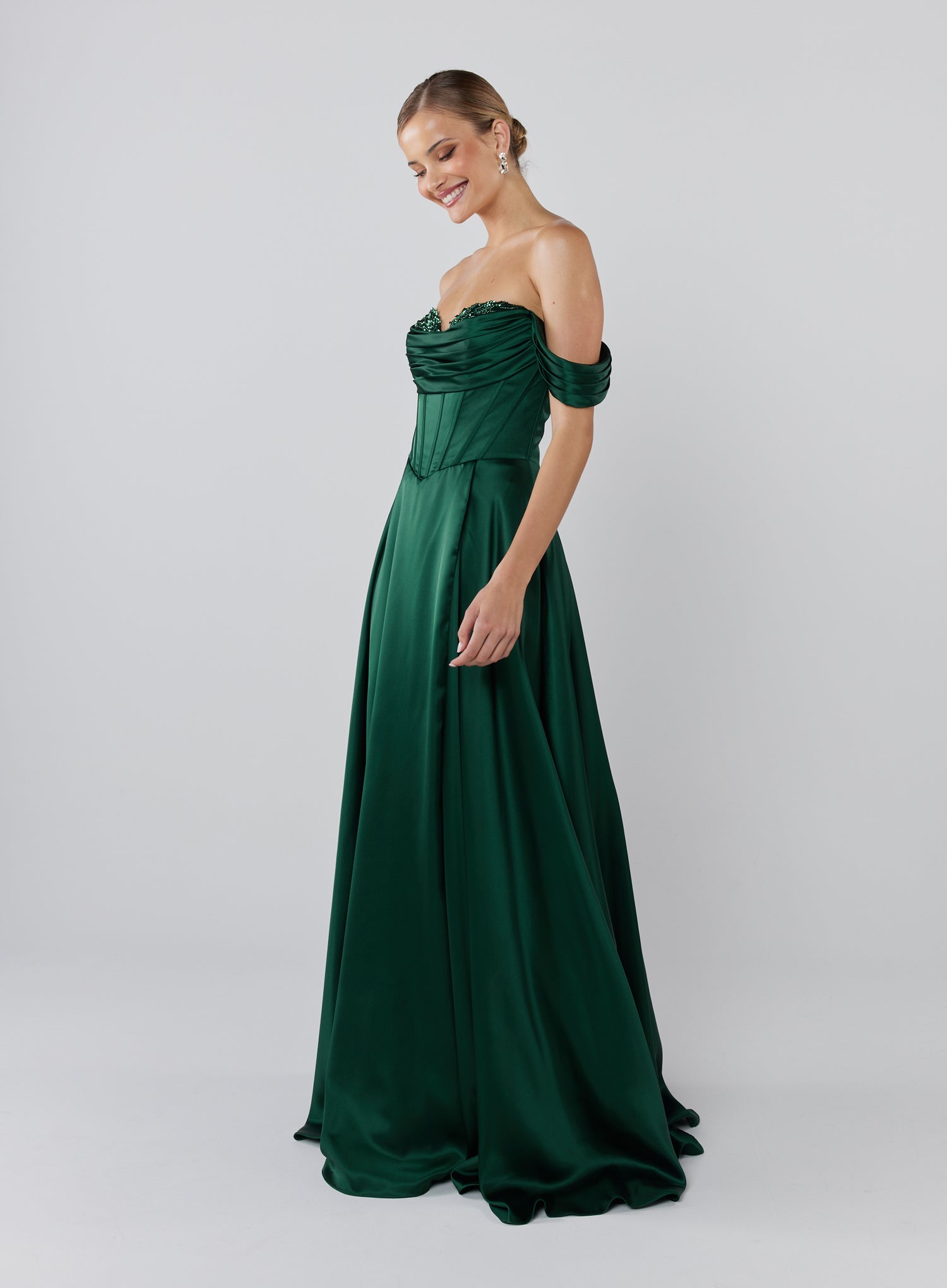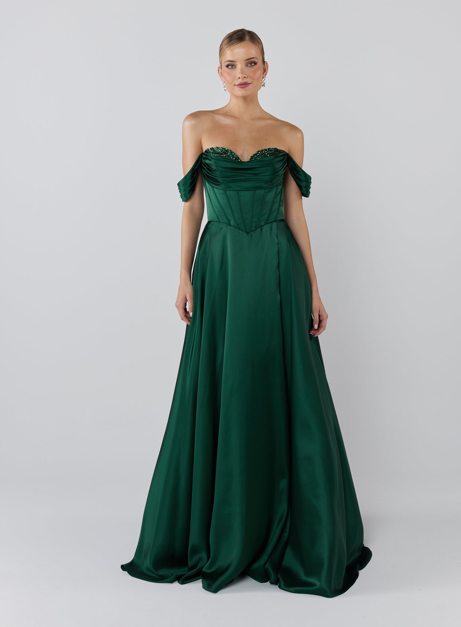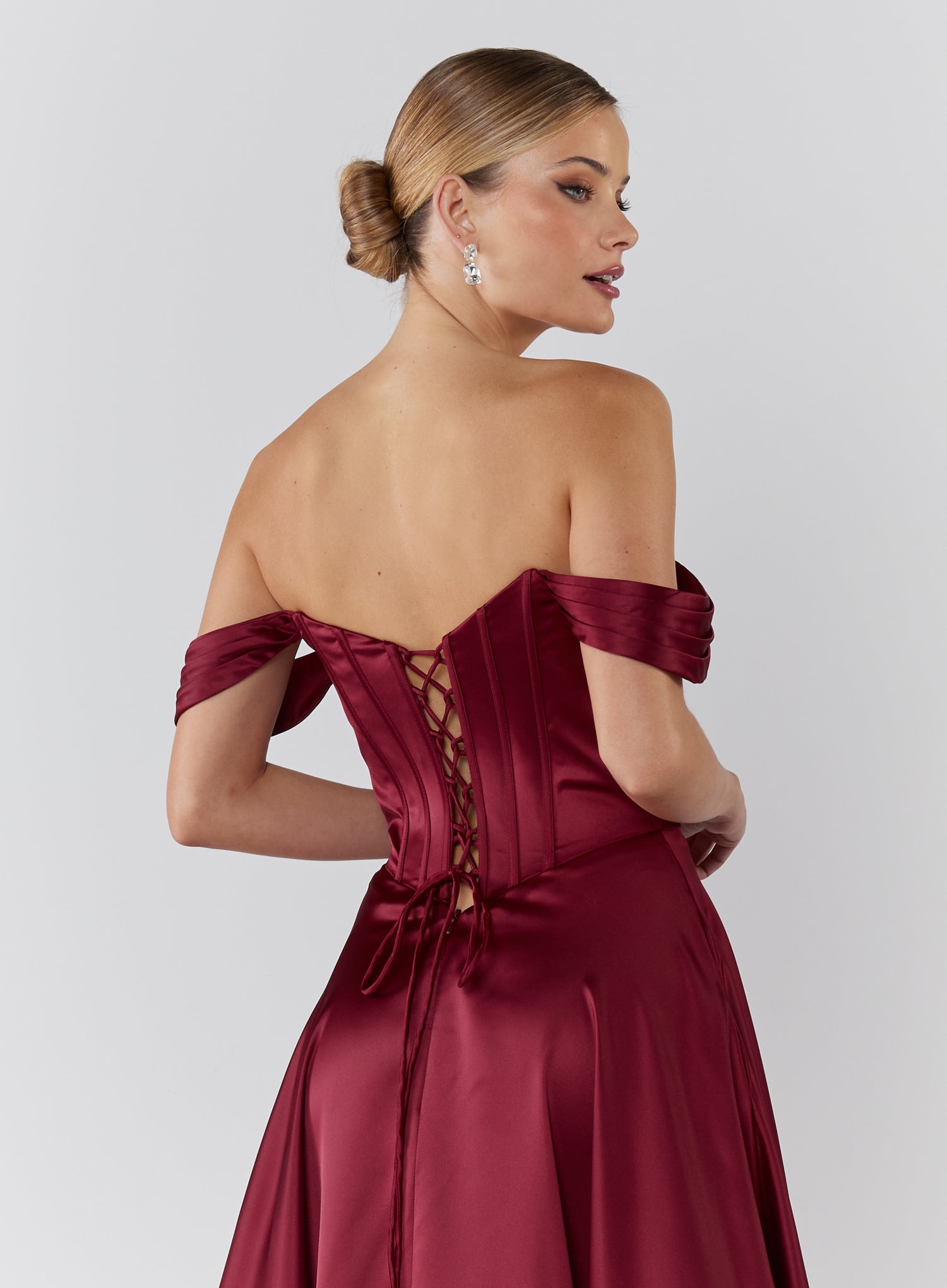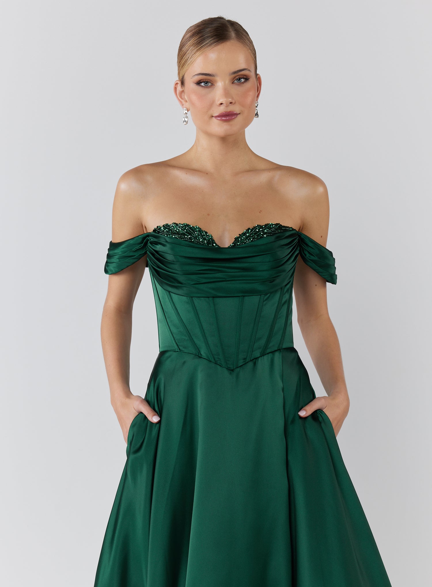 The Cosette Formal Dress epitomizes modern romance with its graceful A-line silhouette and luxurious satin fabric. Designed for the discerning bride, this gown features an elegant sweetheart neckline with peek-a-boo beaded bust cups and exposed boning for flattering structure. Off-the-shoulder pleated straps drape softly across the shoulders, while a strategic front split adds contemporary flair and practical movement. The adjustable lace-up back closure ensures a perfect fit, complemented by an invisible zipper for a seamless look. Timeless yet refreshingly modern, the Cosette delivers the sophisticated elegance every bride deserves.