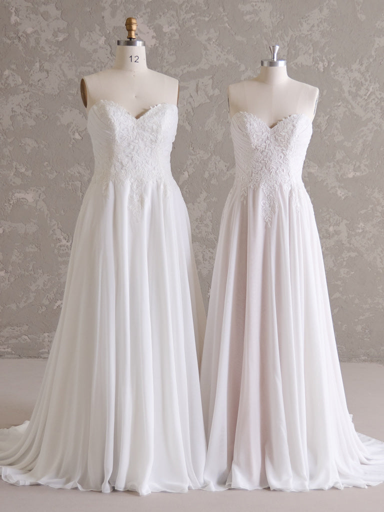 Whimsical Chiffon Wedding Dress With A Thigh-High Slit And Pleated Lace Bodice by Rebecca Ingram