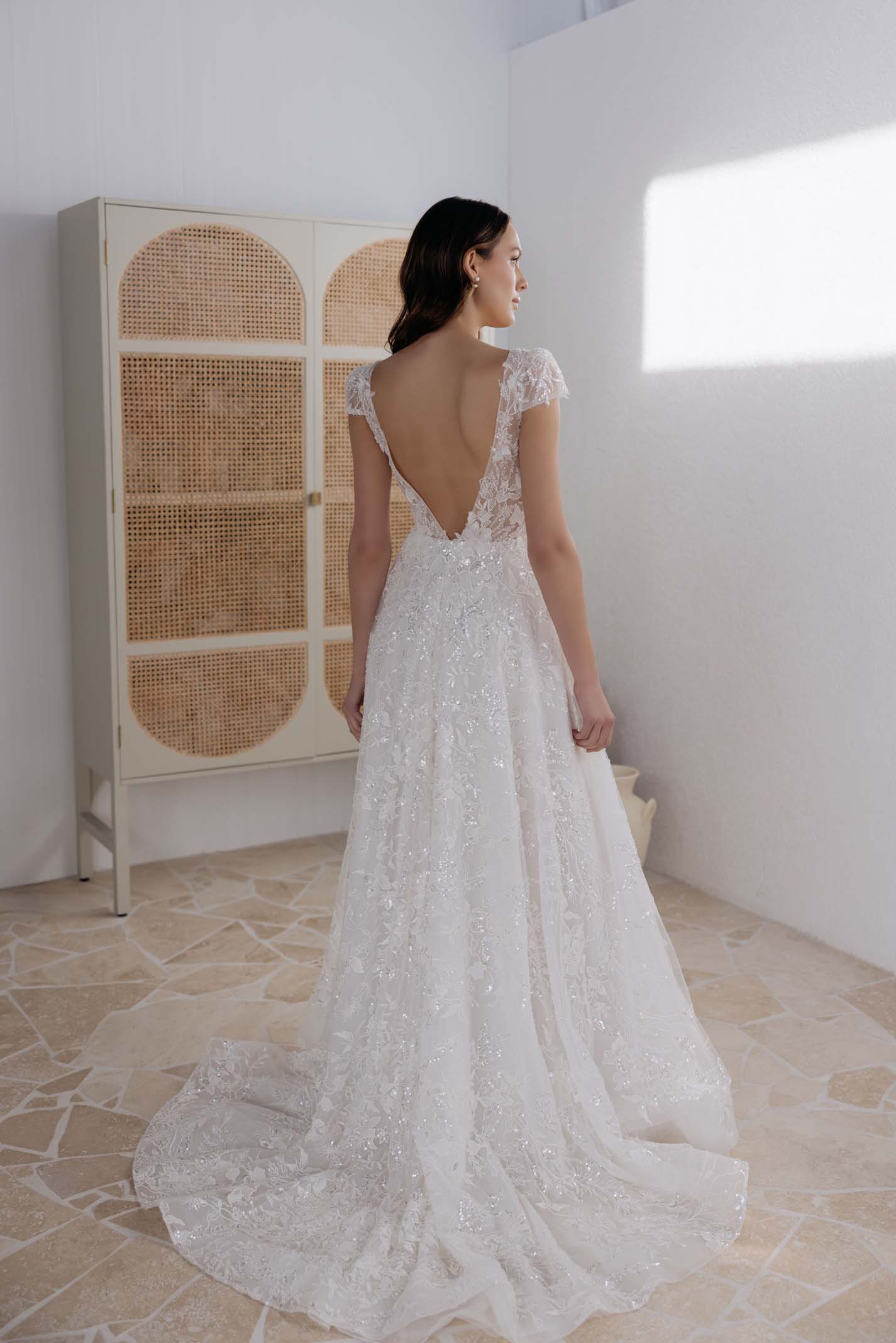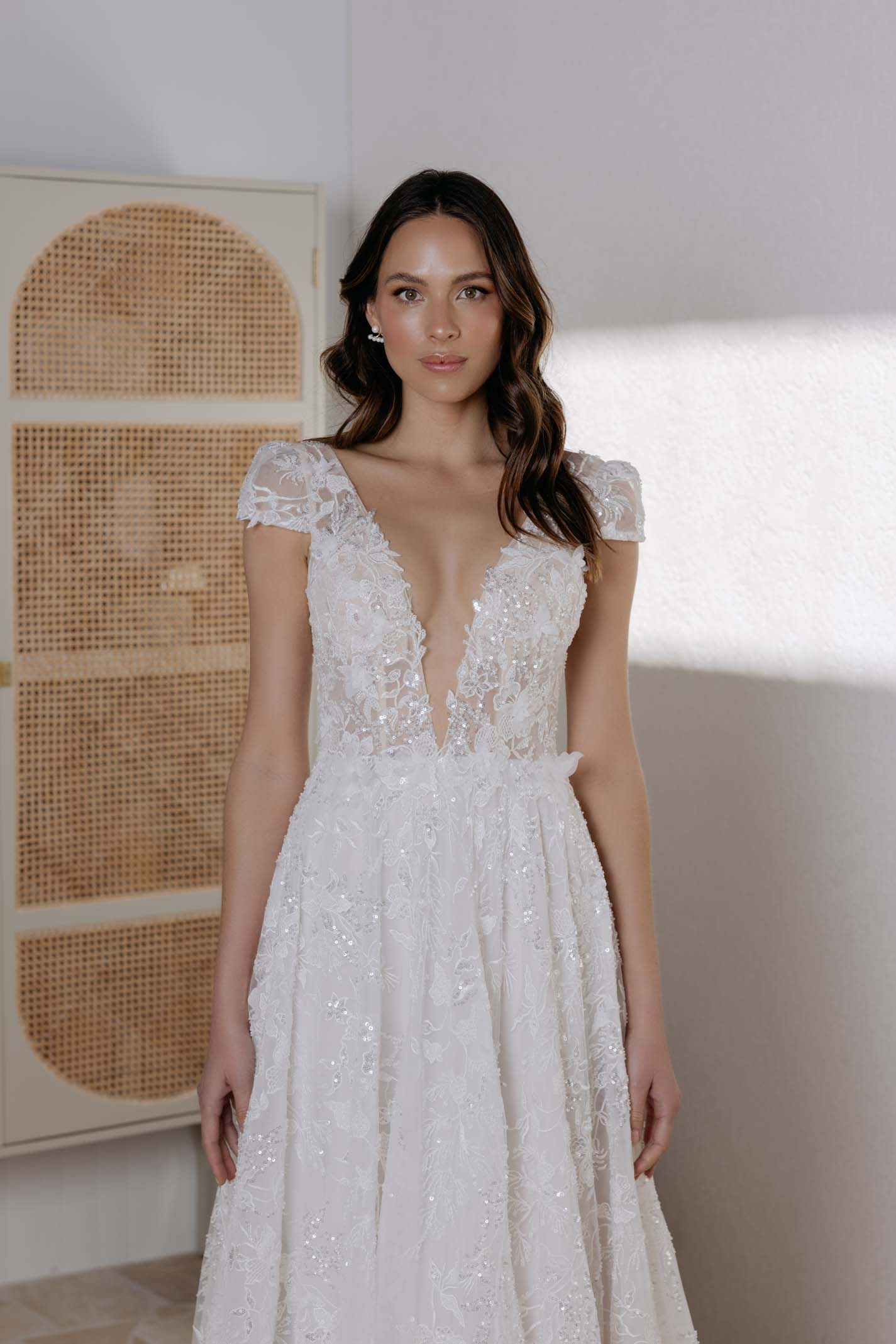Our Dani gown is a dress like no other. With a deep V-cut neckline and short sleeves, Dani exudes a modern yet romantic feeling.