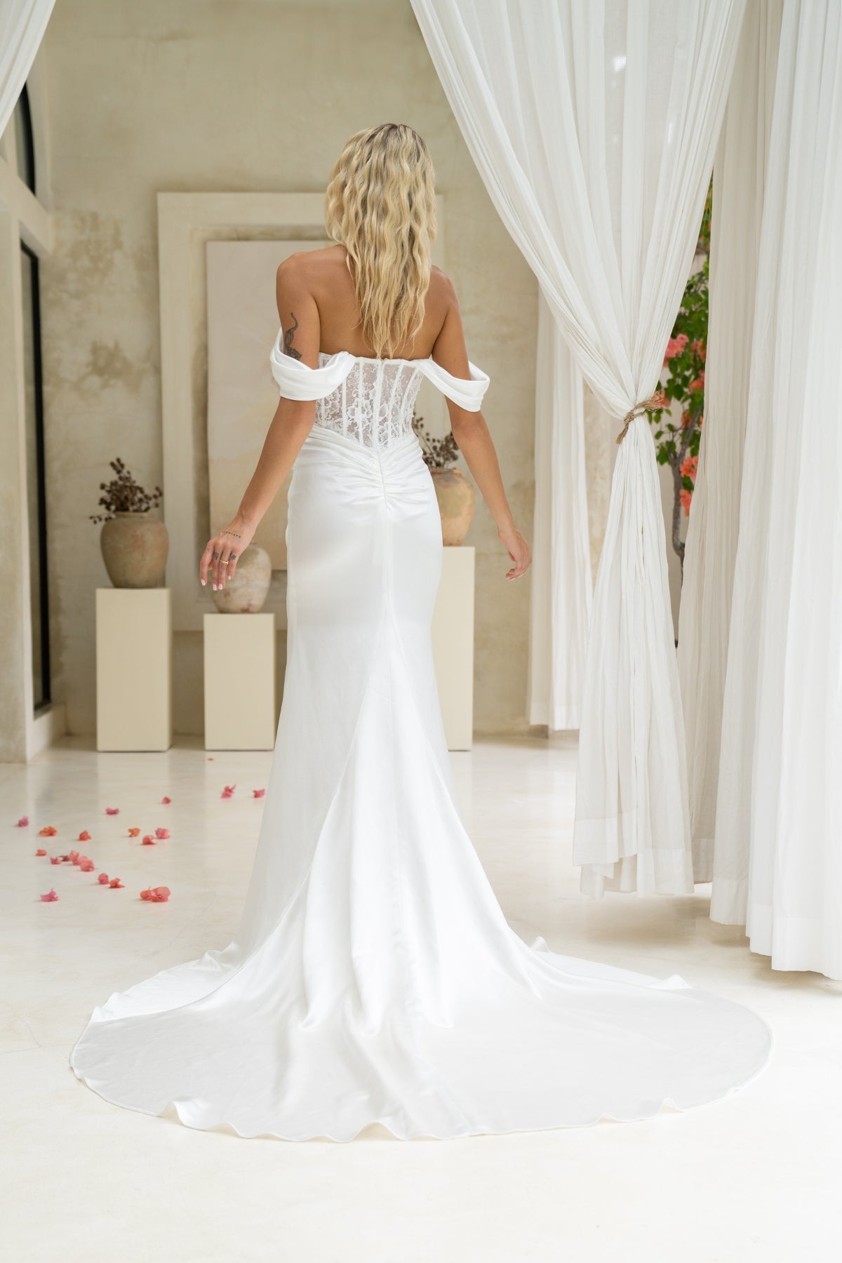 Where bridal allure and style converge, the Delta wedding dress captures timeless romance in every stitch. This exquisite gown features a luminous Charmeuse fabric that drapes with ethereal elegance, while the softly ruched waist sculpts your silhouette with flattering intention. The corseted bodice, reinforced with fine boning, delivers a flawless, confident fit that moves with you. Delicate cap sleeves frame your shoulders with understated grace, and a subtle front split adds just the right touch of movement and allure to the sleek fit-and-flare design. Perfect for the bride who desires both sophistication and subtle sensuality on her wedding day.