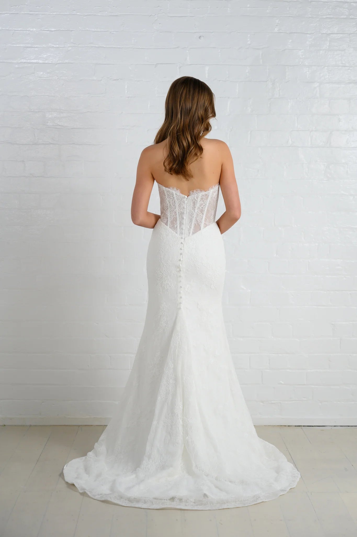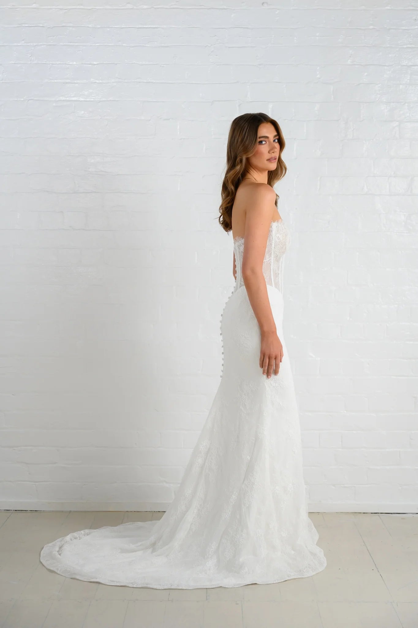 Eden enchants with its corseted cat-eyed bodice delicately overlaid in intricate chantilly lace, creating a romantic and elegant silhouette. This fitted gown blends timeless sophistication with soft, feminine details, making it the perfect choice for a bride seeking a graceful and unforgettable look on her special day. Optional Sleeve avaiable.