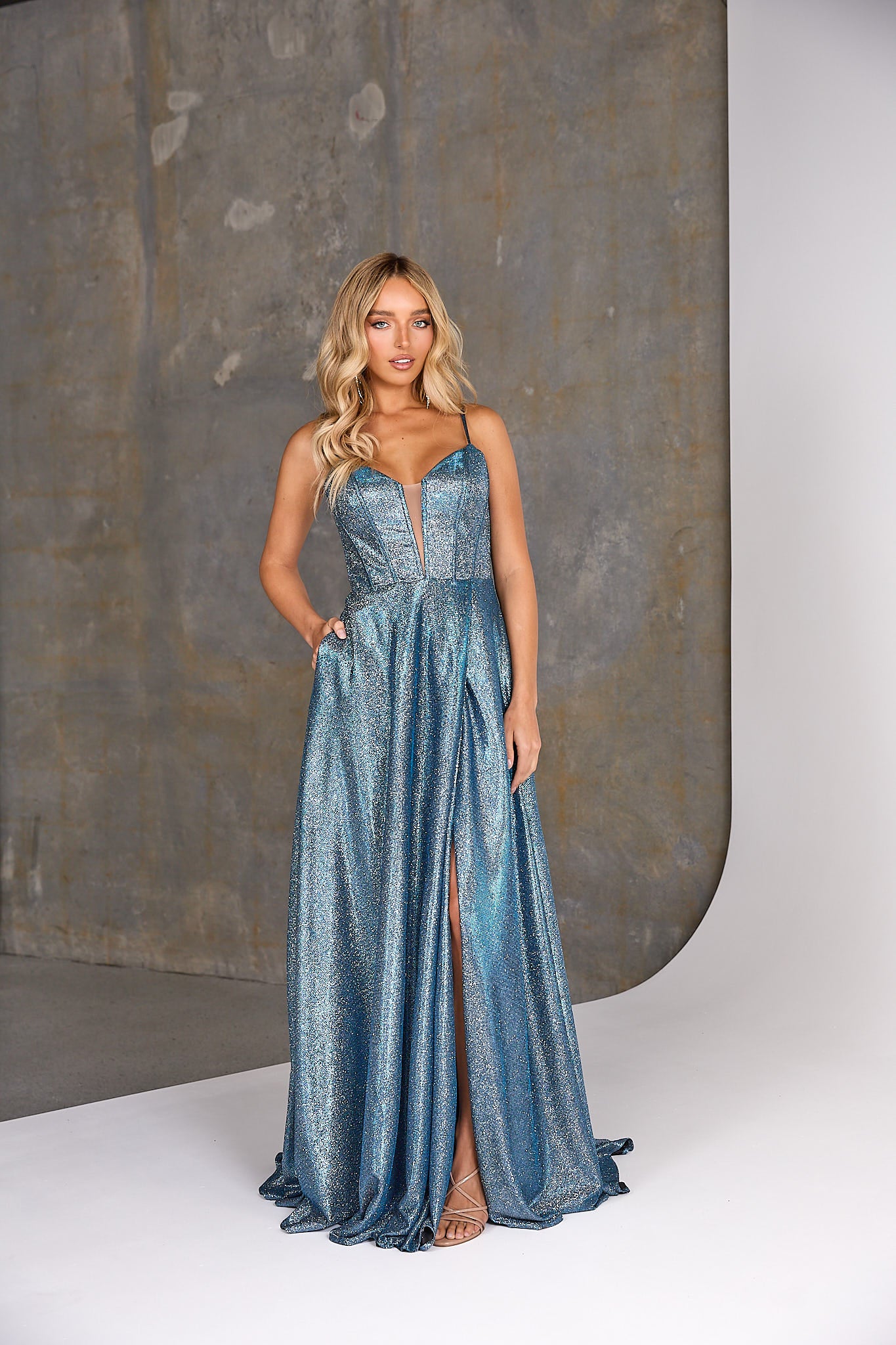 Unleash your inner glam with the Eloi dress. This stunning piece boasts a sweetheart neckline, V plunge front, and exposed boned corset for structure. The A-line skirt with a side split allows for effortless movement, while inner bra cups provide comfort and the perfect fit. Perfect for formal events, with a touch of modern elegance.