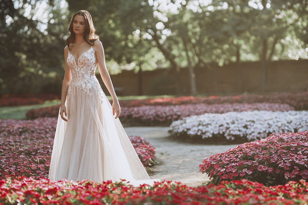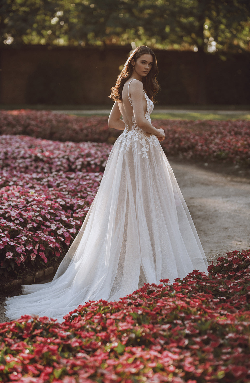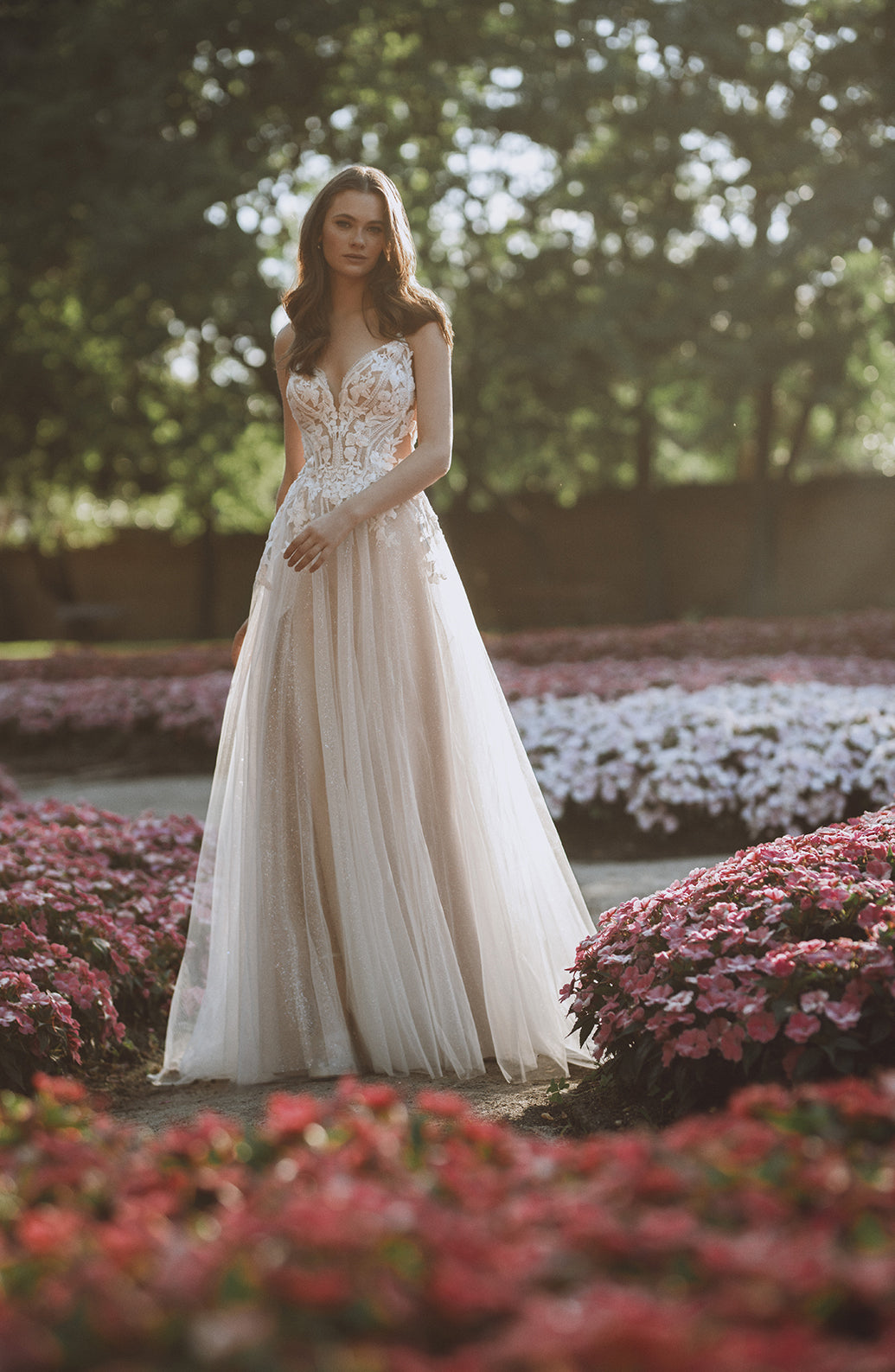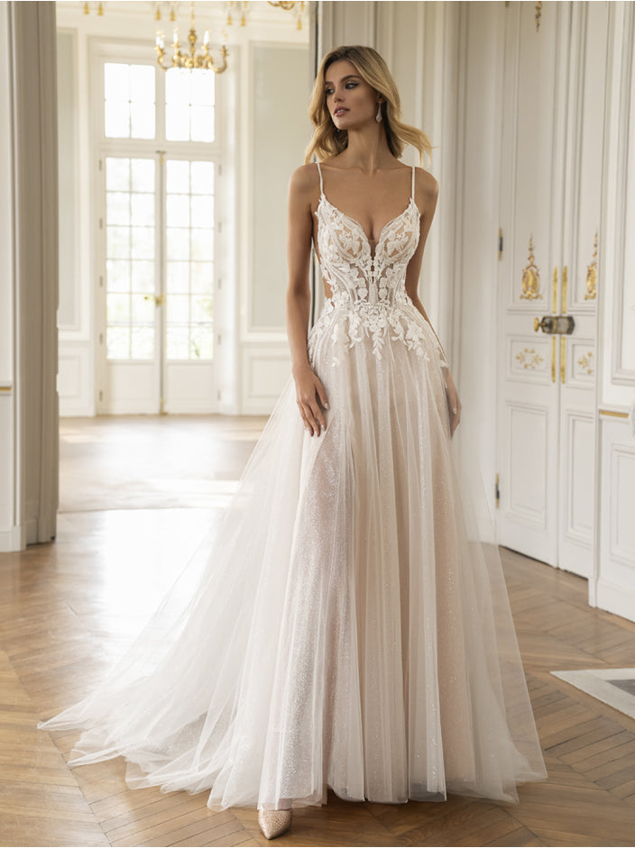Calling all of our sweet, modern brides! ELORA presents a glimmering V-neckline bodice with delicate beaded straps for a soft glam look. The shimmering floral embroidered lace and beaded geometric lace cascade down into the soft glitter tulle which overlays the sexy hidden high slit skirt for the dreamiest bridal look.