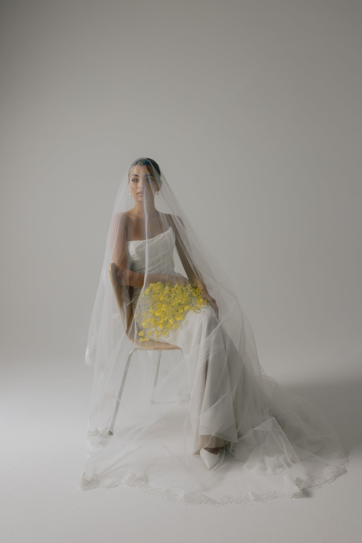 Erin is a stunning chiffon fit-and-flare gown that redefines modern romance. Its strapless bodice features visible corset boning and a structured basque waist, enhancing the neckline with elegant support. A lace-up back adds timeless charm, while the fitted chiffon skirt flows gracefully with every step. Complete your bridal look with a matching chiffon scarf or lace-bordered veil for added drama and effortless sophistication. This first fitted chiffon design is sure to captivate and leave a lasting impression on your special day.