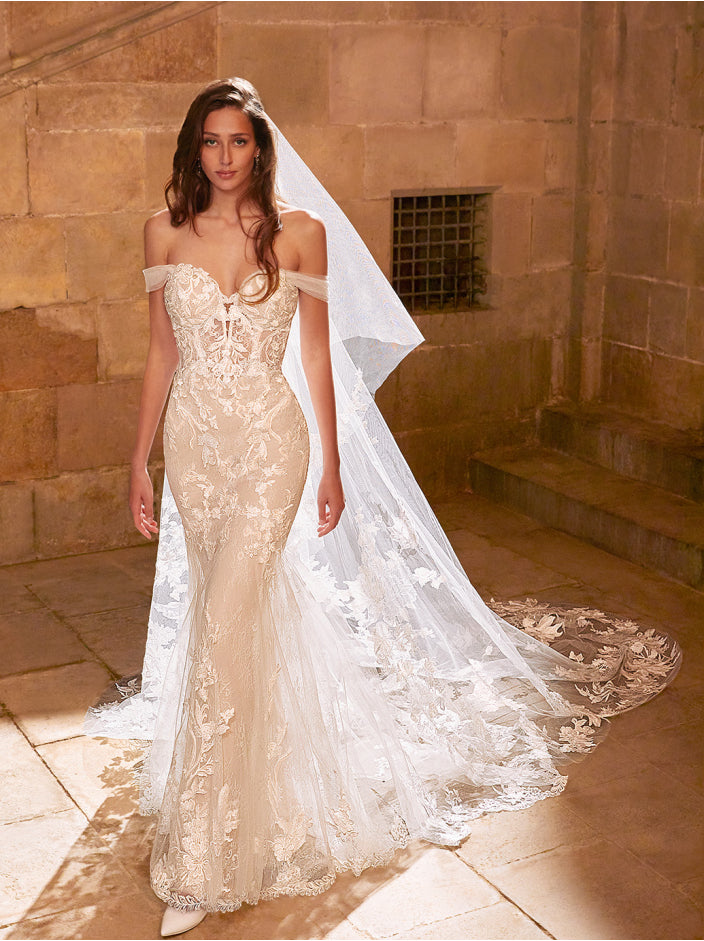 Detachable off-shoulder straps are a romantic and versatile element detail on this mermaid gown with floral embroidered lace, chantilly lace, and tulle. A soft, stretch jersey lining ensures comfort and body-contouring support, while a signature ÉLYSÉE sculpted hem brings all the drama and elegance.