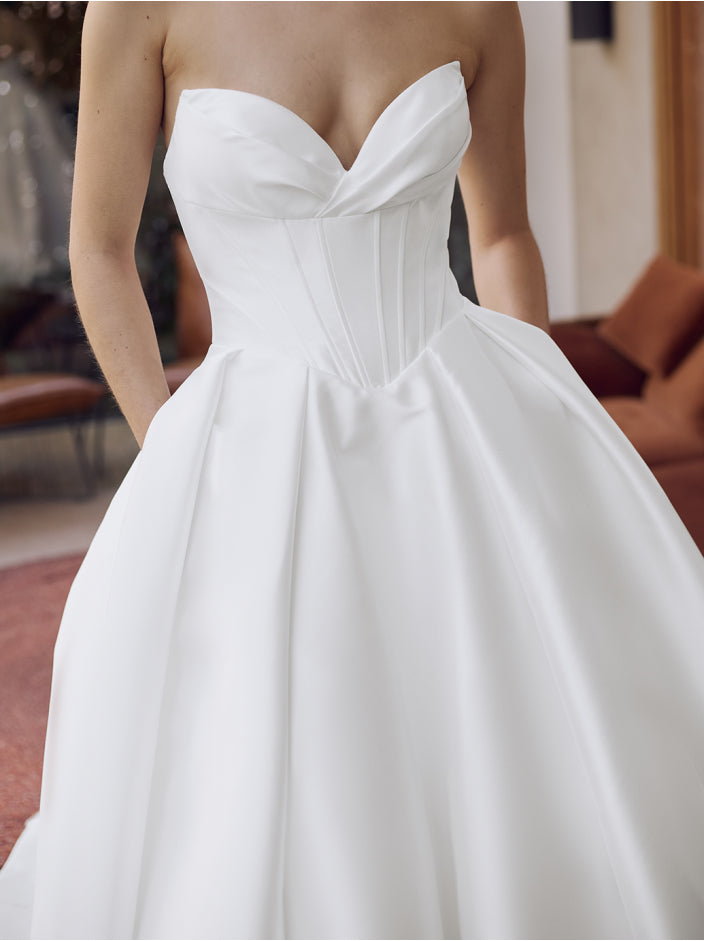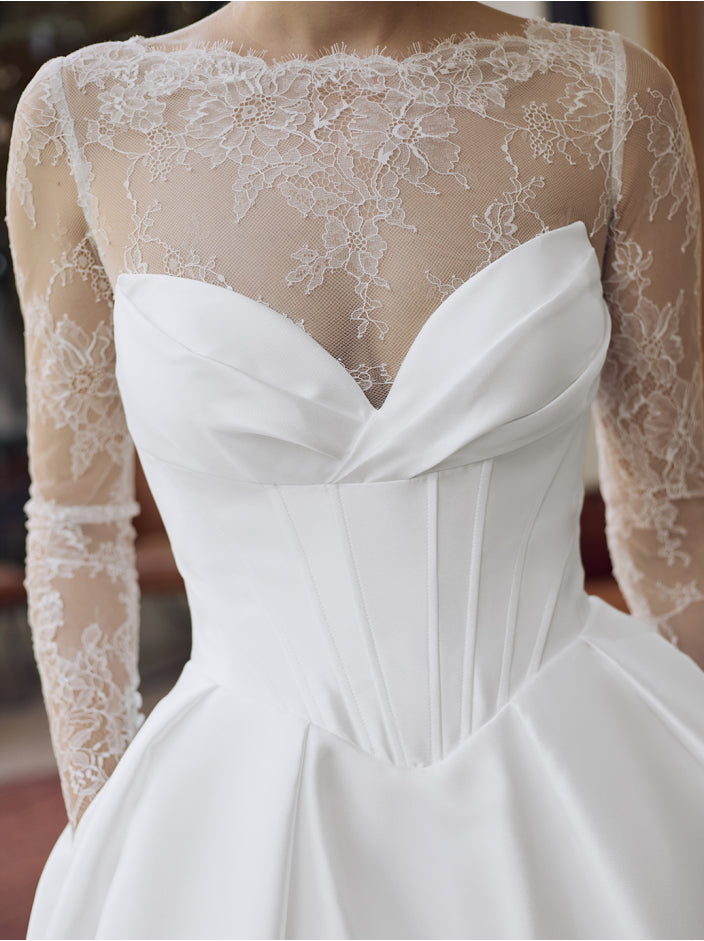 The Giovanna-M Dress and Jacket Mikado from the Élysée collection combines timeless elegance with modern design. Crafted from delicate chantilly lace and smooth satin, this ballgown features a flattering sweetheart neckline and a sculptural silhouette. The romantic long sleeve lace jacket adds a unique layer of sophistication, while practical pockets bring a playful, functional element. Perfect for brides who want a dreamy yet refined look, Giovanna offers both style and comfort for your unforgettable walk down the aisle.
