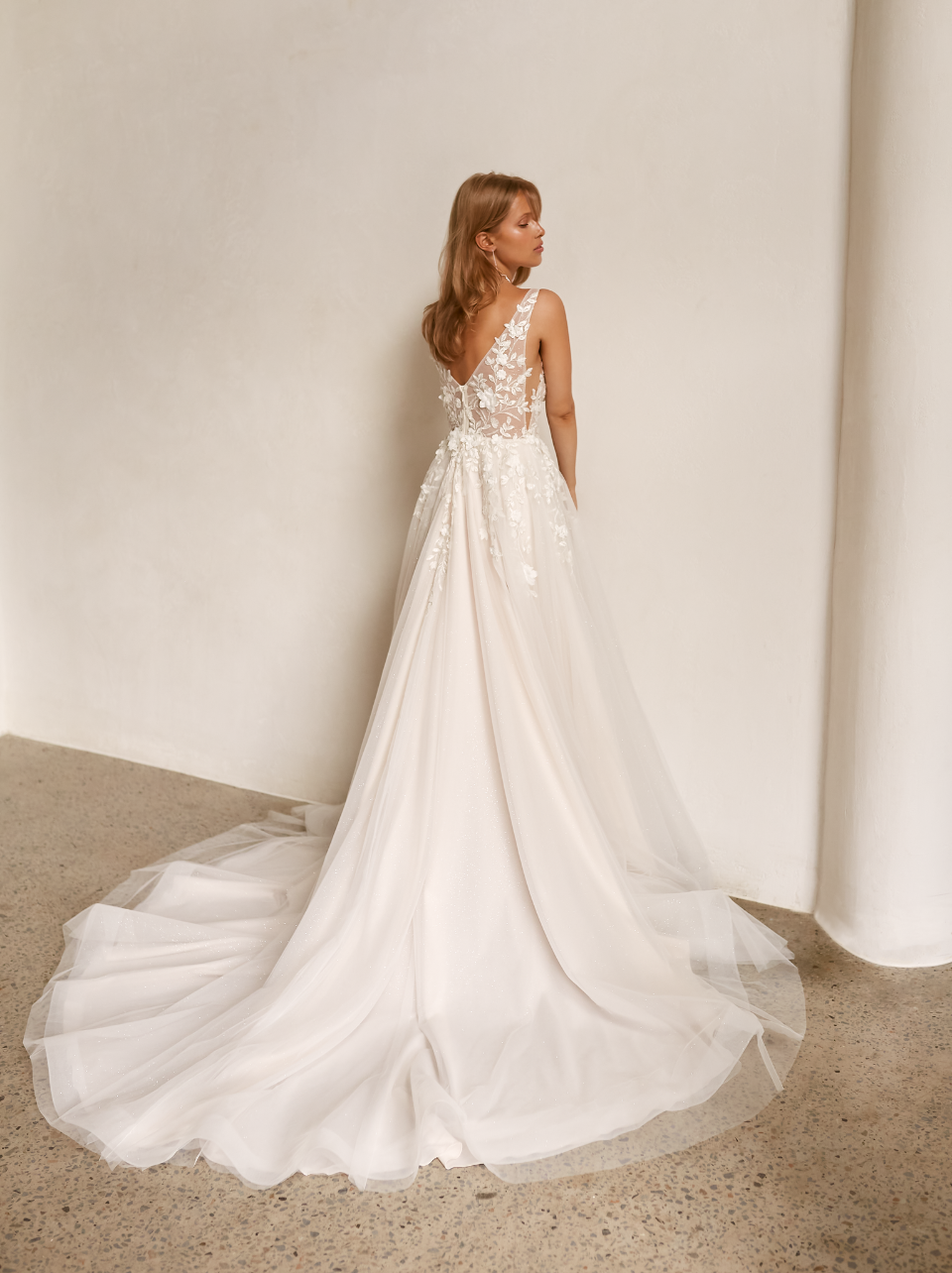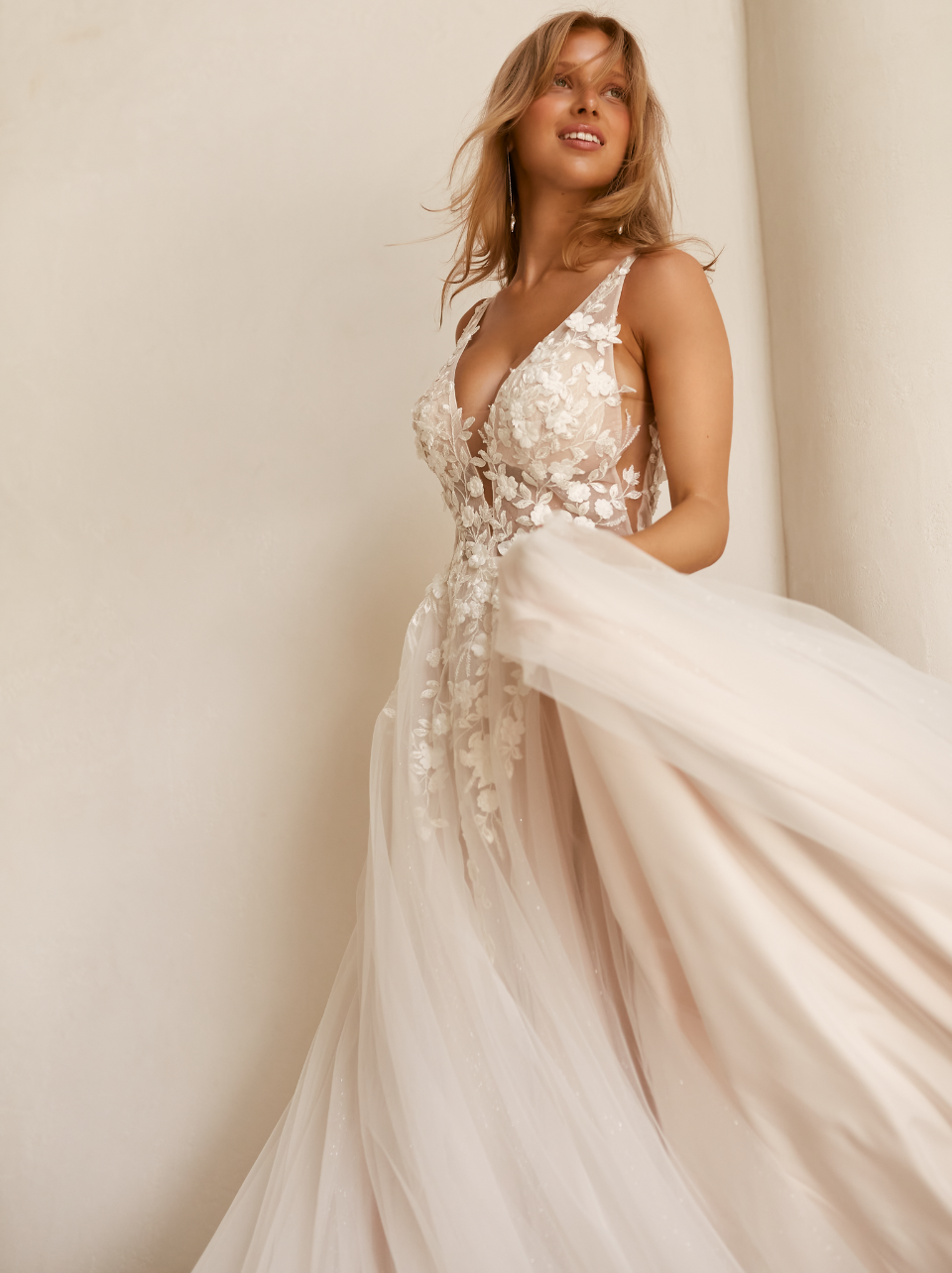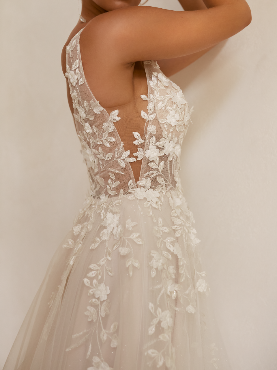 The Lucille wedding dress is a timeless a-line silhouette. Featuring an illusion plunging v-neck bodice with delicate 3D botanical lace that cascade from the thick straps through to the hip. The underarm panels and centre front feature nude tulle modesty panels. The voluminous skirt is finished with a thigh high split soft satin lining.