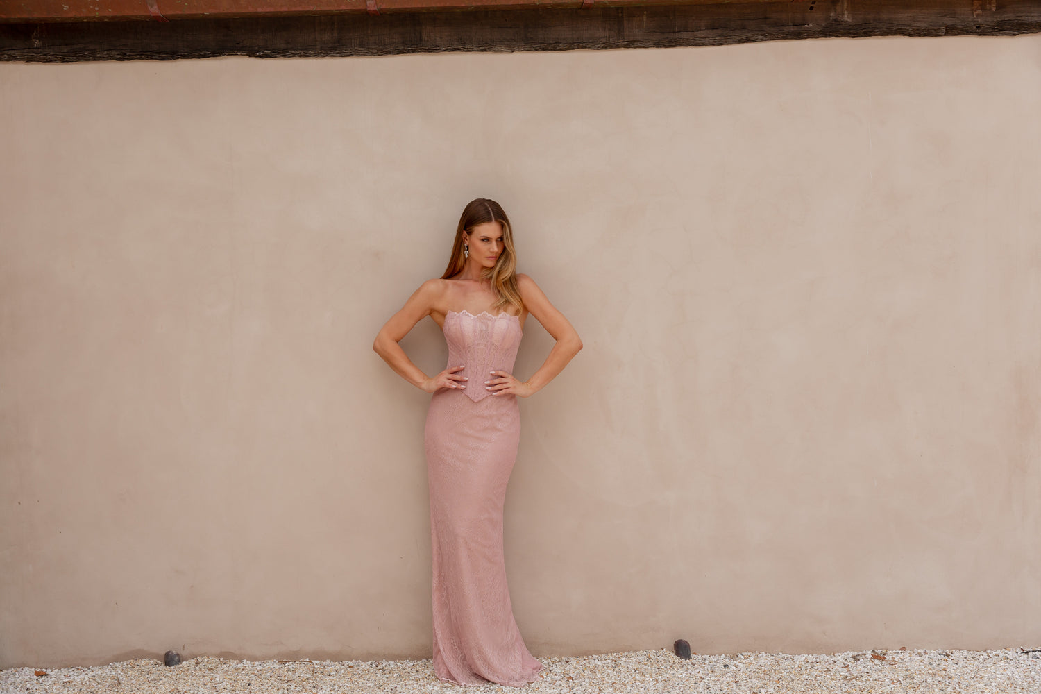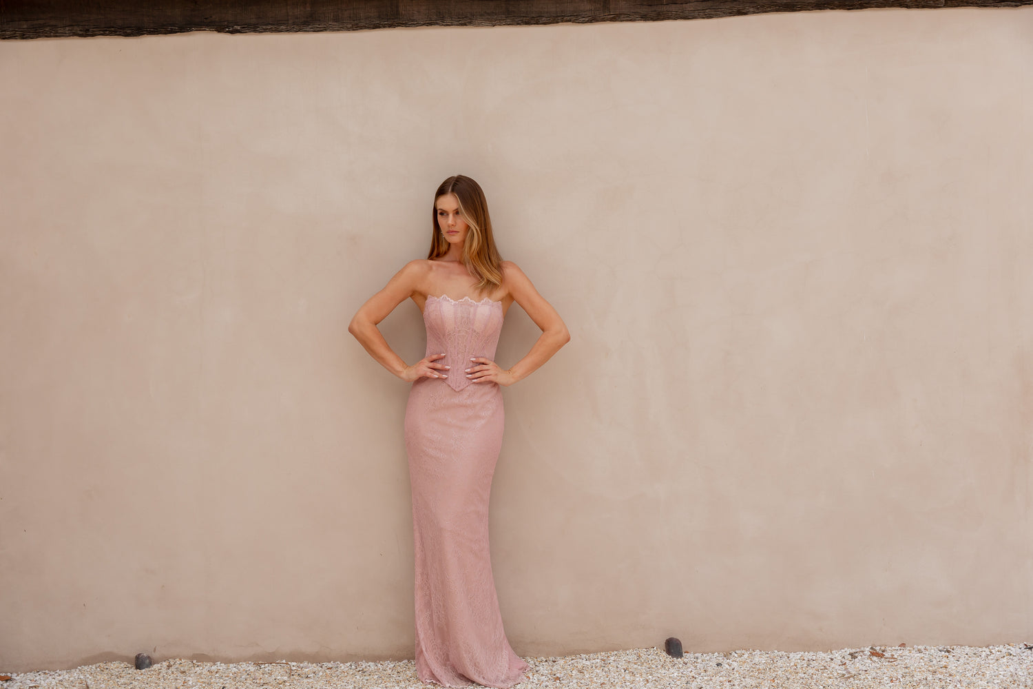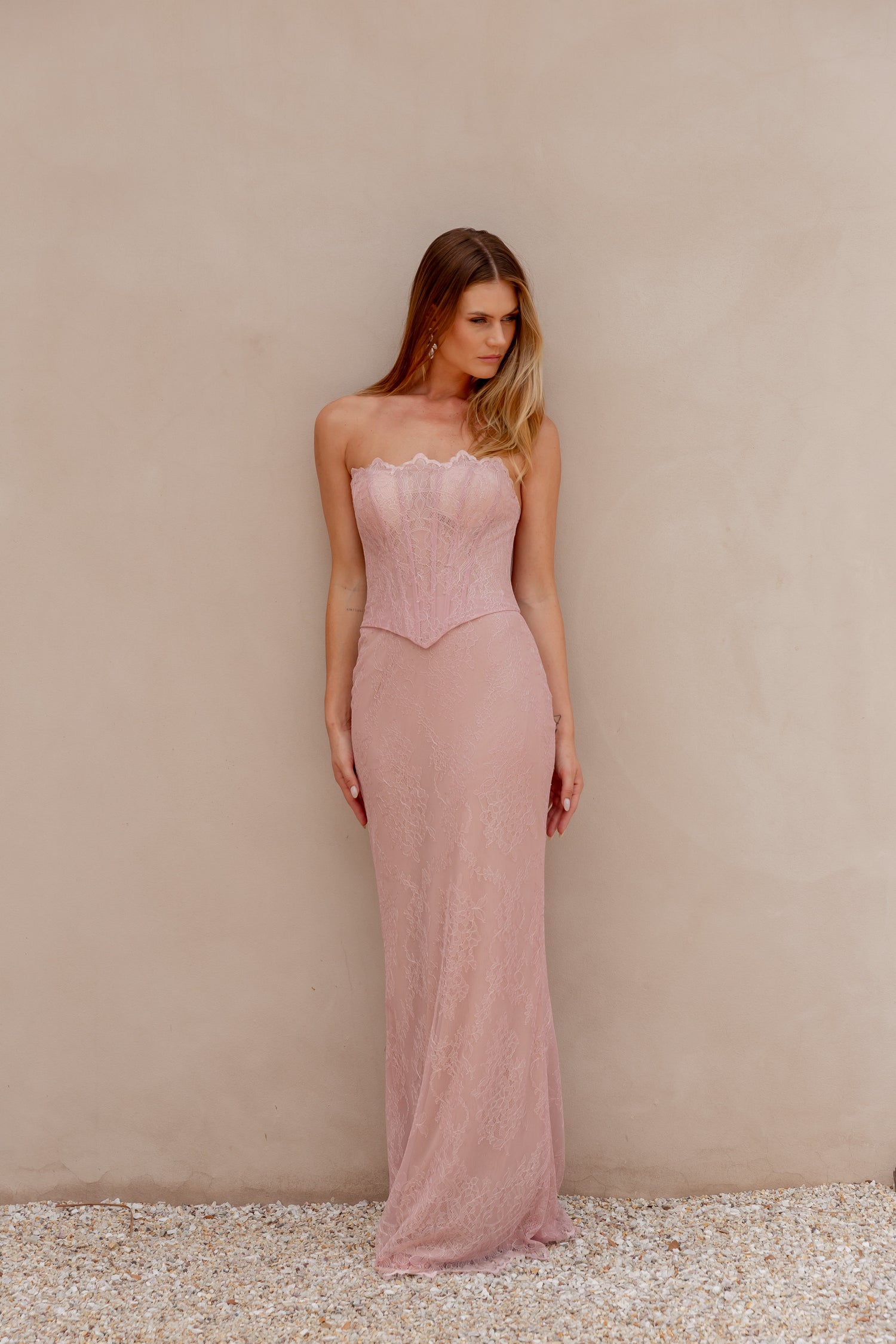 Sophisticated and seductive, the Mada Formal Dress features soft lace layered over jersey knit for a comfortable, flattering fit. Its illusion corset bodice with structured boning accentuates your waist and displays delicate lace detailing for a romantic touch. The invisible back zip combined with a lace-up feature ensures a secure and adjustable fit, while the back split allows elegant movement. Designed to highlight your silhouette from every angle, this gown embodies modern elegance with timeless allure.