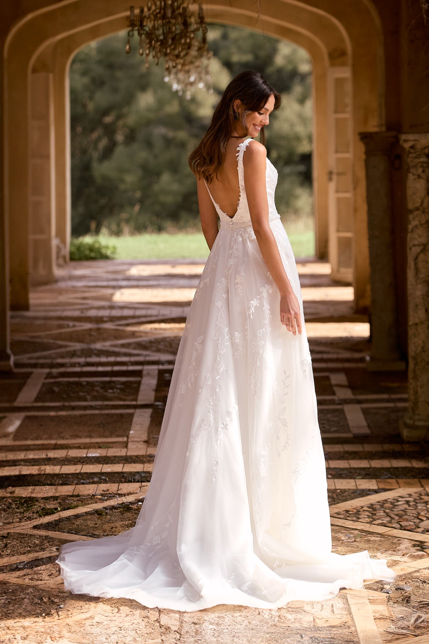 The Marlene Wedding Dress exudes timeless elegance with its classic V neckline and mid-plunge design. The mid-low scoop back features decorative buttons that extend to the waist, adding a refined touch. The A-line skirt flows beautifully into a chapel train, perfect for a grand entrance.
