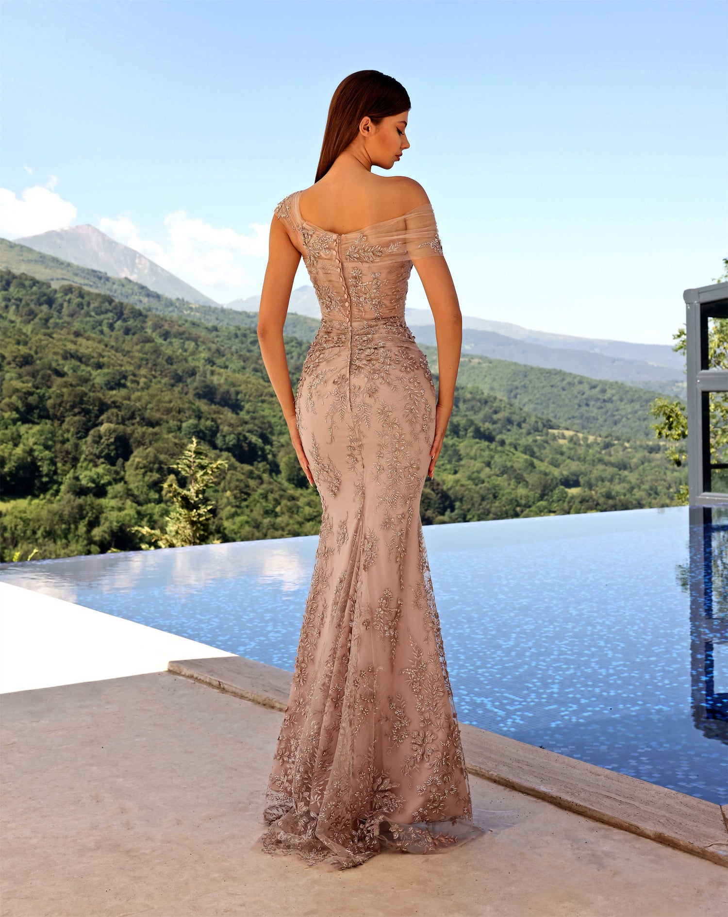 The NC2066 gown by Nicoletta captivates with its elegant semi-straight sheer neckline and a striking combination of off-the-shoulder sleeve and a sheer thick strap, both embellished with a textured sequin pattern. Its high split adds a glamorous flair, making it a perfect choice for those seeking timeless sophistication with a modern edge.