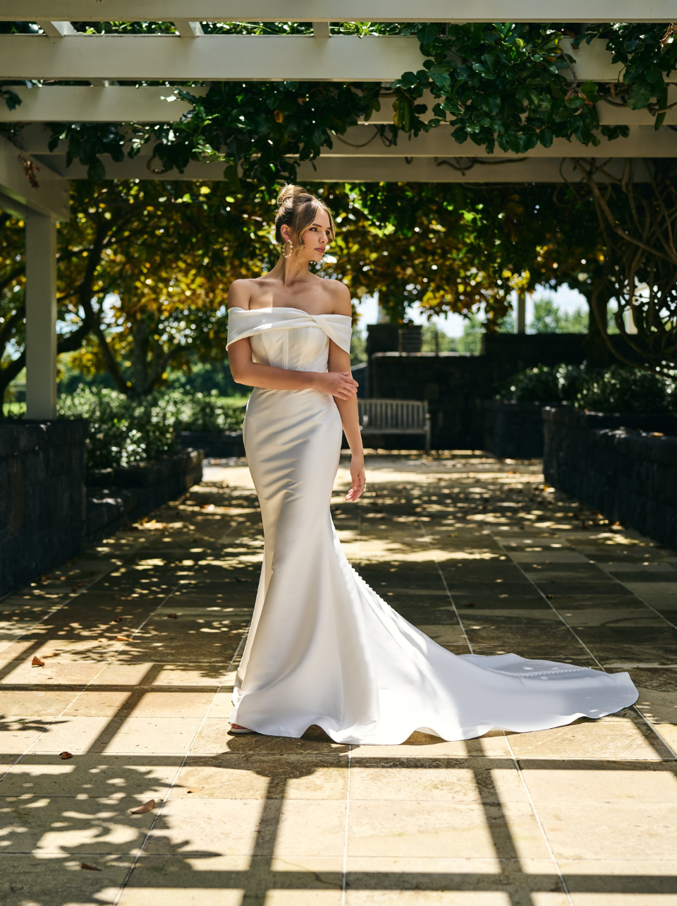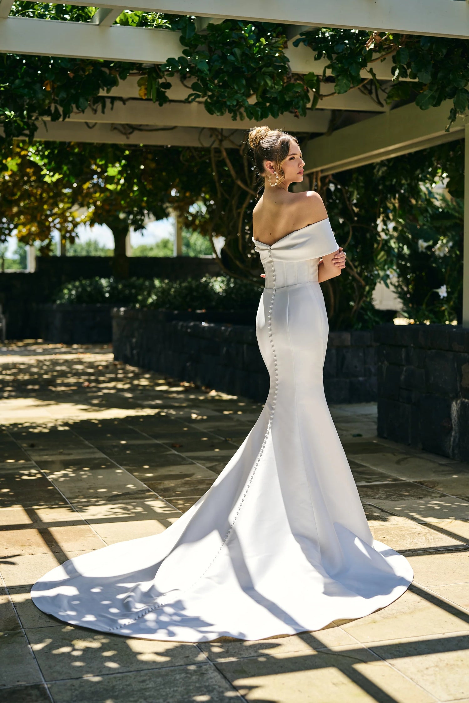 Crafted with mikado fabric Paden will hug you in all the right places with its fit n flare silhouette. Featuring off-the-shoulder straps that wrap romantically around your arms. The dress is fitted with boning that supports the bust and cinches at the waist. The finer button detailing that is followed along the full length train, Paden will be a gown you will never want to take off.
