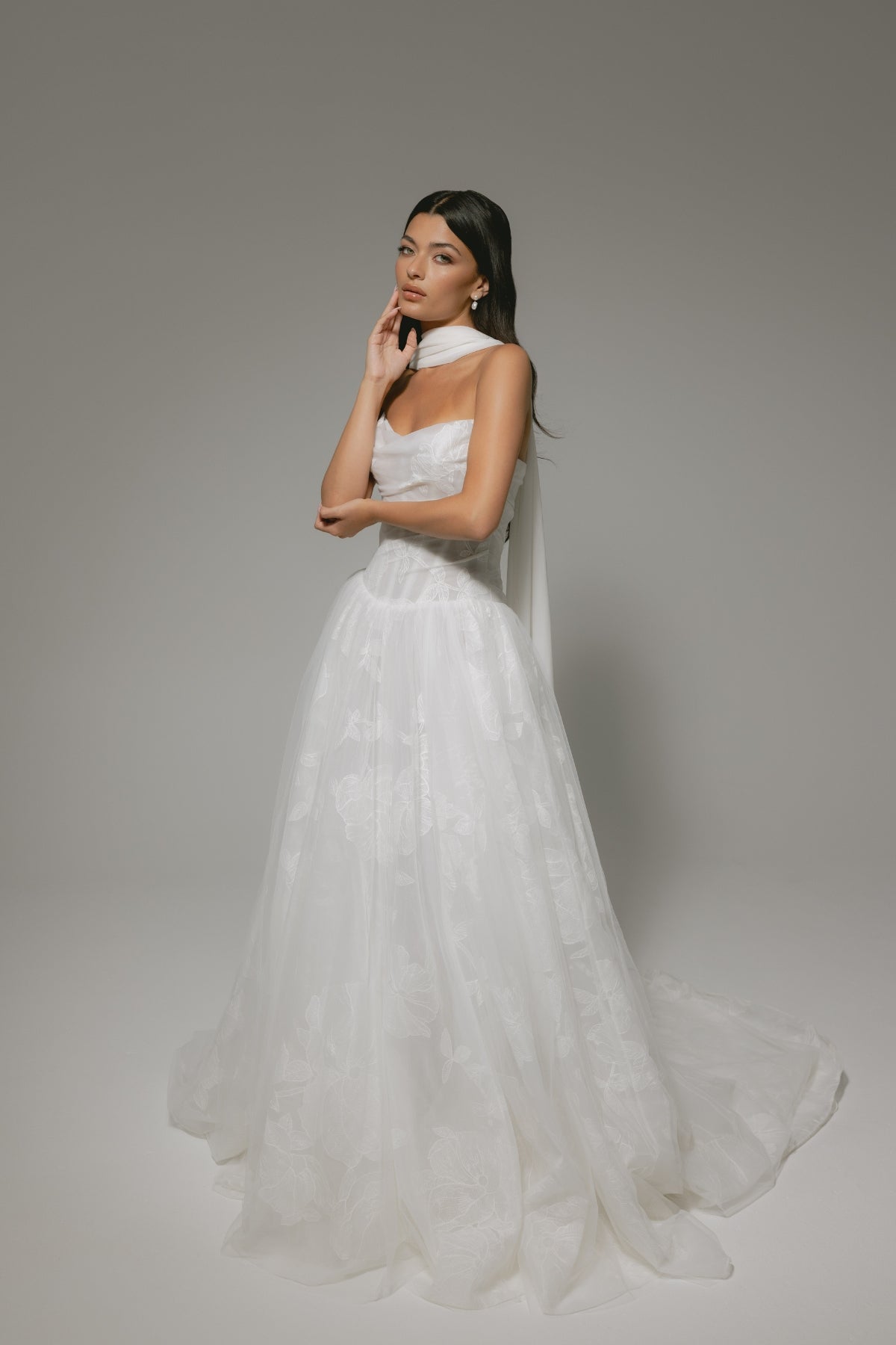 Experience elegance redefined with Paloma, a stunning two-piece bridal ensemble designed to captivate. The strapless corseted top, adorned with lace, pearls, and delicate beaded chains, highlights your silhouette by cinching the waist and emphasizing curves. Its luxurious satin A-line skirt, featuring bold pleats and a sleek waist belt, adds a touch of modern sophistication. Complete with a matching statement choker, Paloma offers the perfect blend of timeless grace and runway-ready glamour for the bride seeking to make a lasting impression.