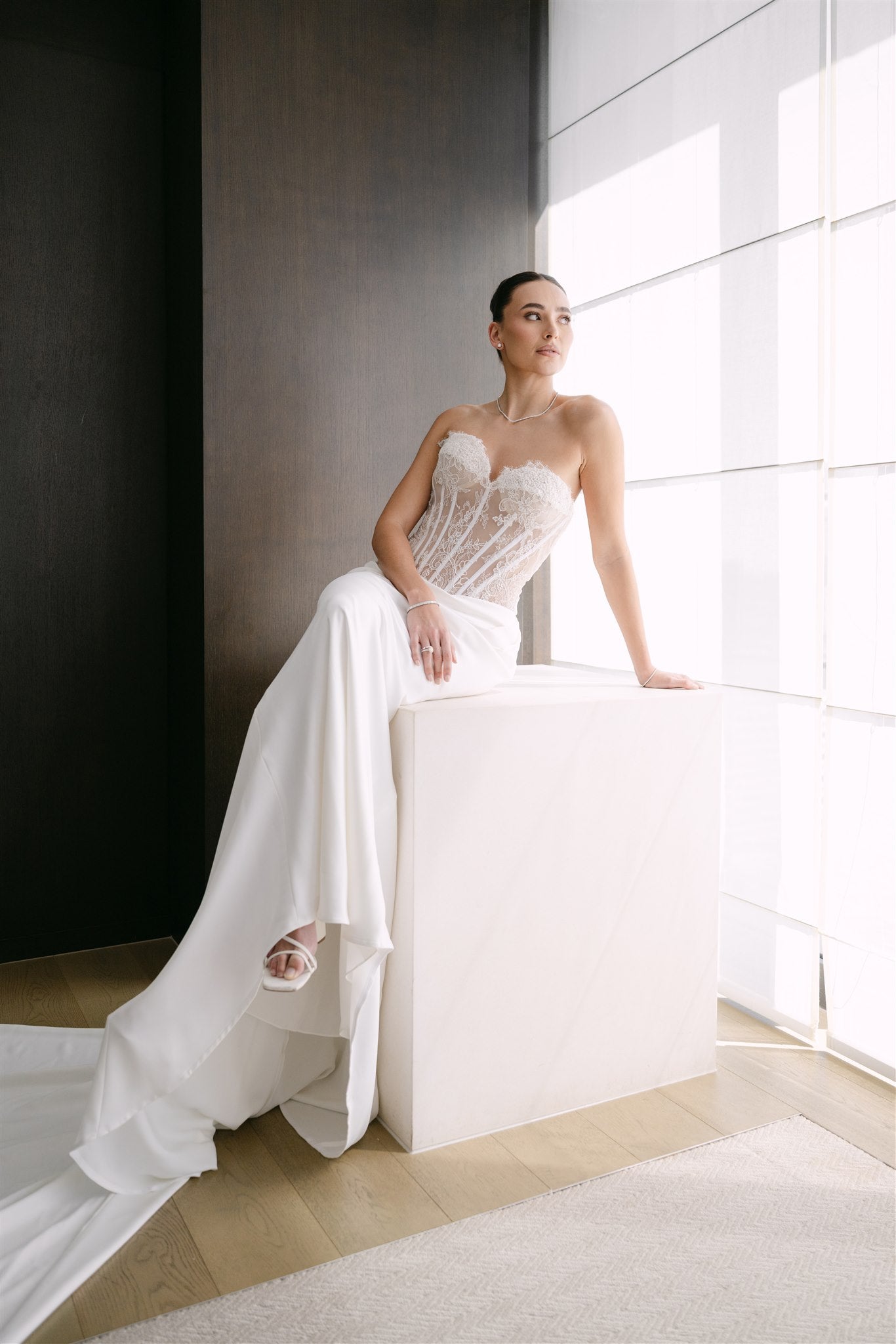 Discover elegance with the Shaylee SE081, a strapless sheer corset mermaid dress designed to highlight your silhouette beautifully. Featuring an optional detachable jacket and a panel train, this bridal gown offers versatile style and graceful movement for your special day. Perfect for brides seeking a blend of modern sophistication and timeless charm. Coming Soon to Archela Bridal