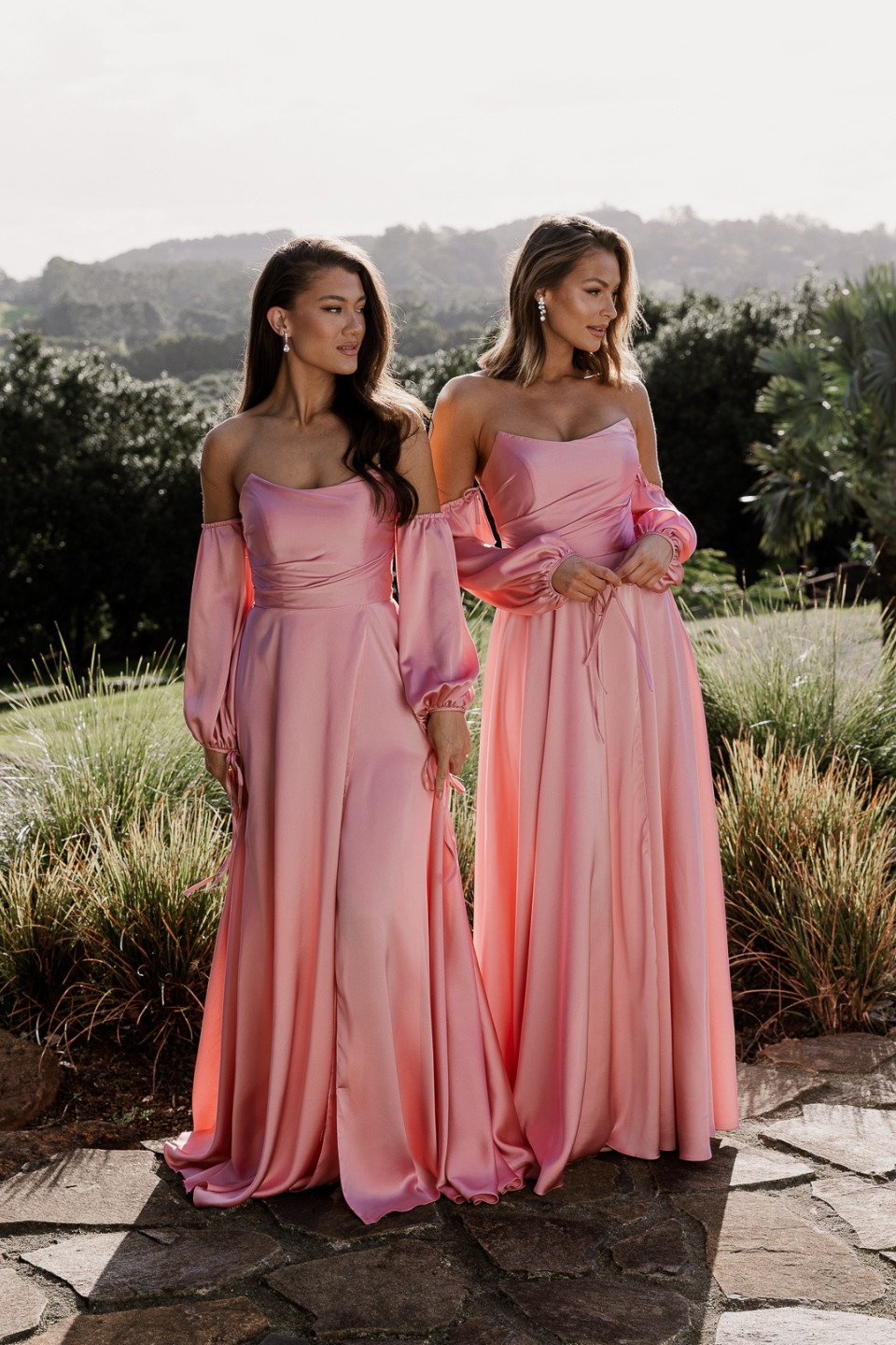 The Violette TO895 Bridesmaid Dress is floor length, light satin wedding guest gown with detachable long sleeves available in sizes AU 4-30. Mix and match this style with our light satin bridesmaids range!
