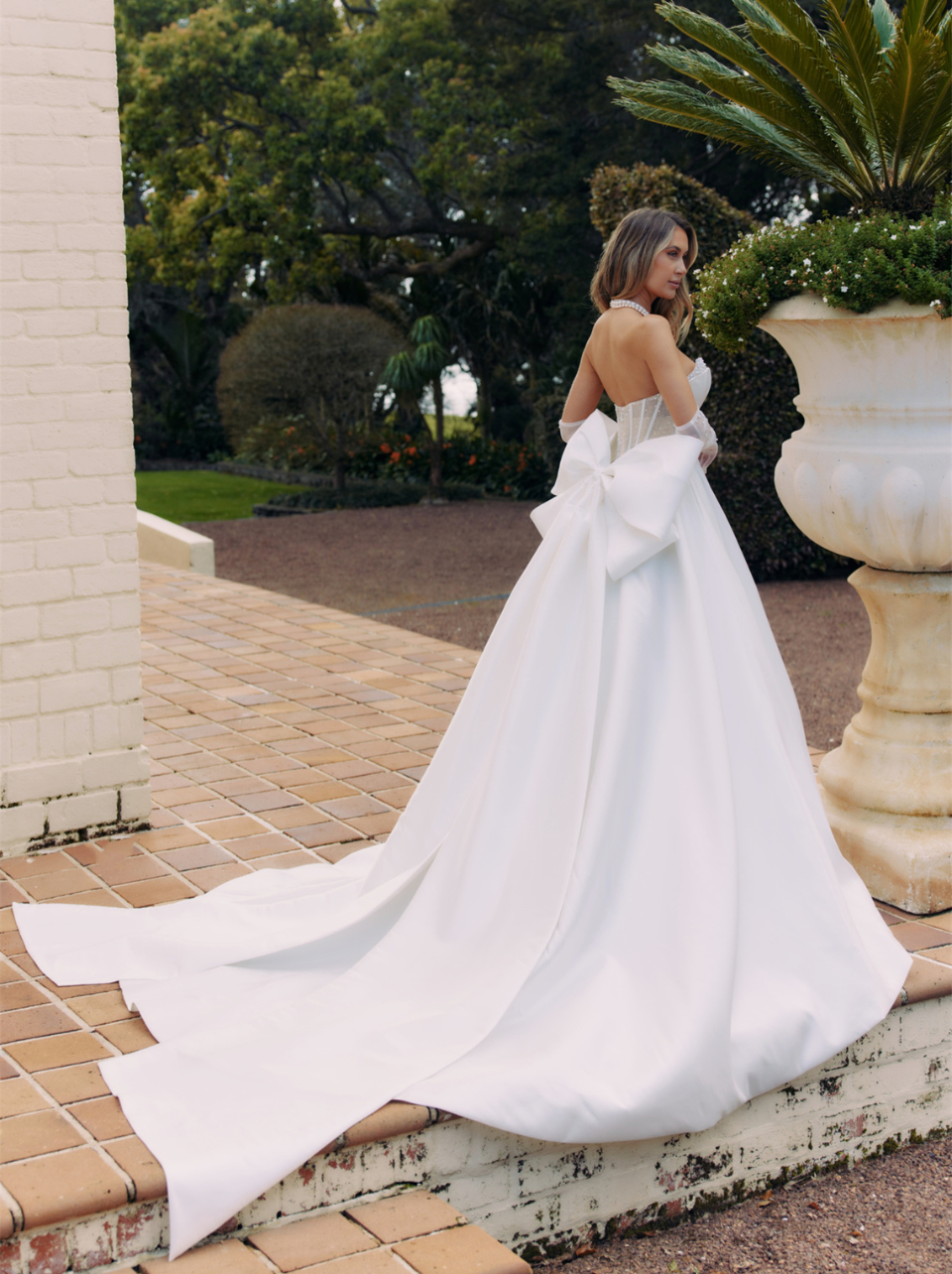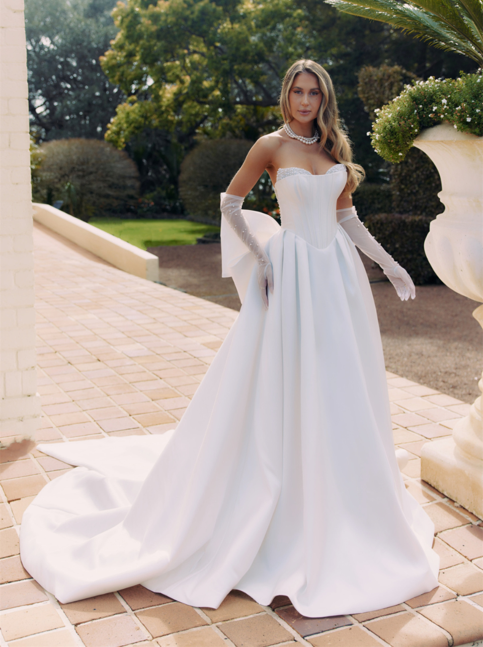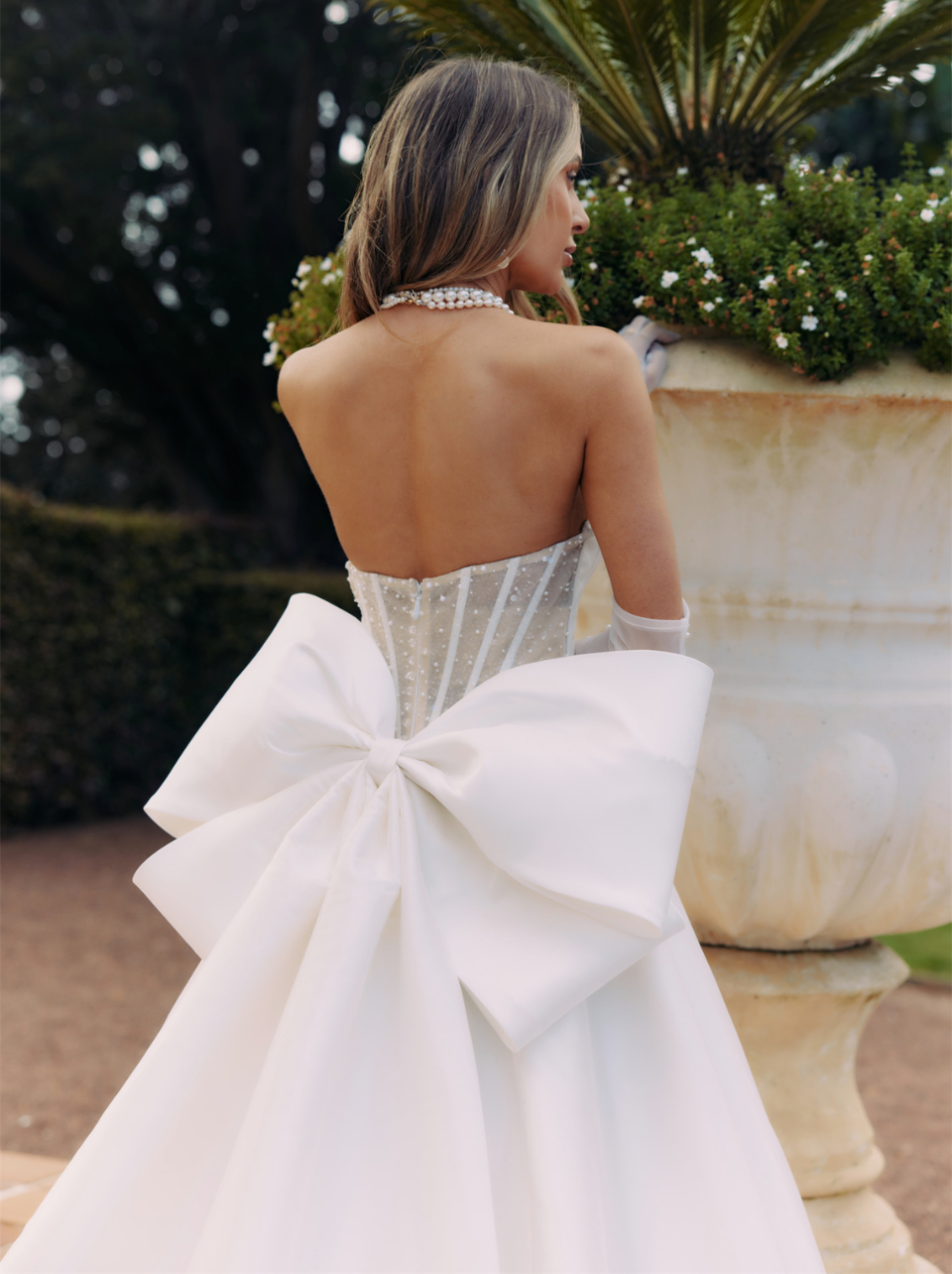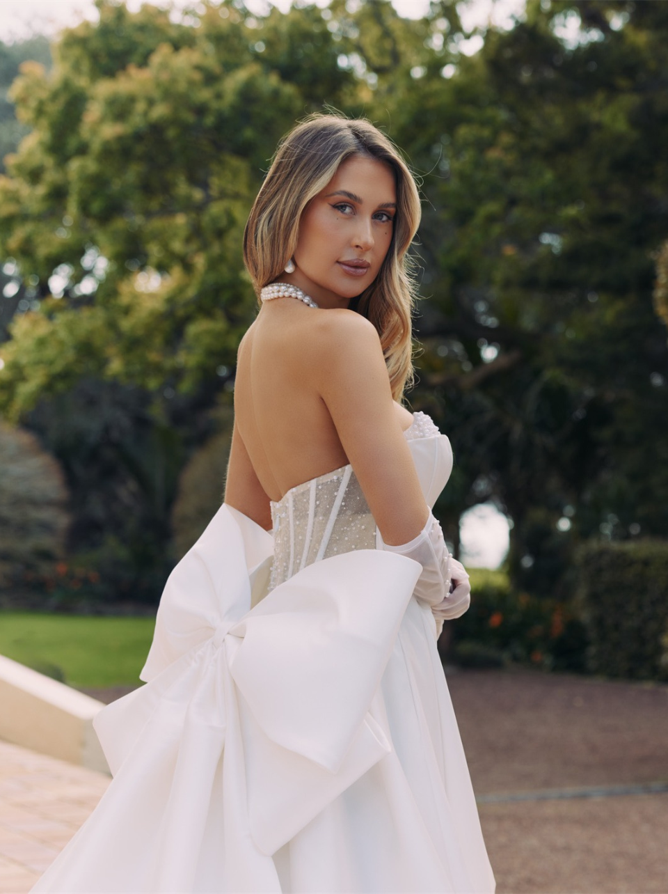 Meet Yvonne, the embodiment of elegance and sophistication - she effortlessly catches attention with her pearl-studded cups and structured bodice. Create a playful, sweet look with the Aisha Bow or let Yvonne shine on her own. Perfect for the modern bride who values clean and chic fashion. Available in store at Archela Bridal.